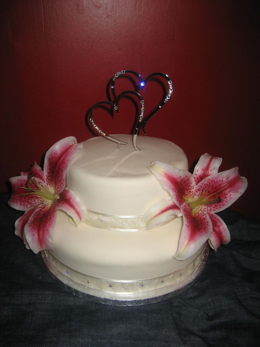 This is my first ever wedding cake and I am quite pleased with it. It was a voluntary cake I did as a gift for some friends of ours who married abroad and then had a party at home. I offered to make them a cake for the party as they hadn't got time to order one. Flowers are real, topper was bought and my sister put the crystals onto the ribbon for me. It took me two nights to do the whole thing, although I was a bit panicky that the lillies wouldn't open in time! The bride really liked it and I'd really llike some feedback from you guys! TFL :-)
