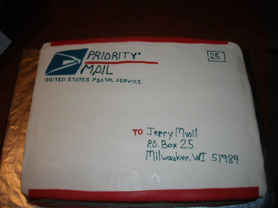 I made this 1/2 sheet cake look like a Priority Mail box for a 25years of service celebration party for a postal employee.