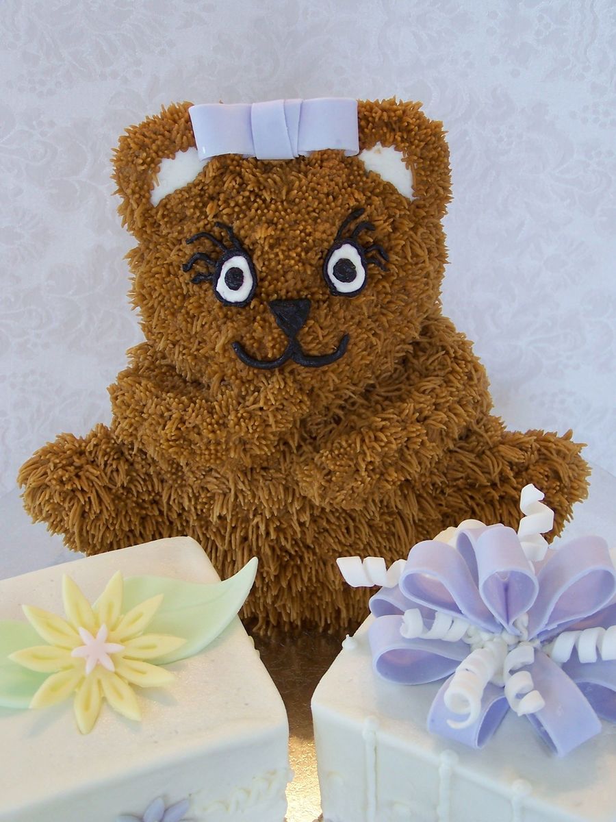 Teddy bear with 2 presents. Had batter left over after filling bear so baked a 1-layer 10" square and then cut four 4" squares and staked them for 2 presents. Bear said it served 12 but I got closer to 20 slices from it.