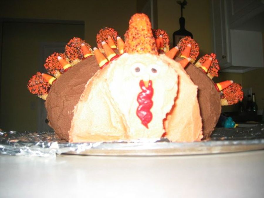 3 pieces of cake put together made into a 3D turkey used cookies for "feathers"