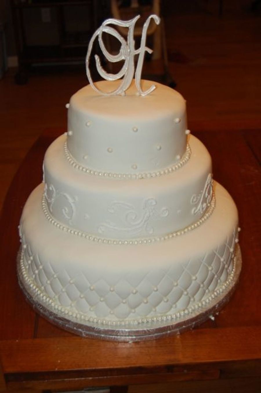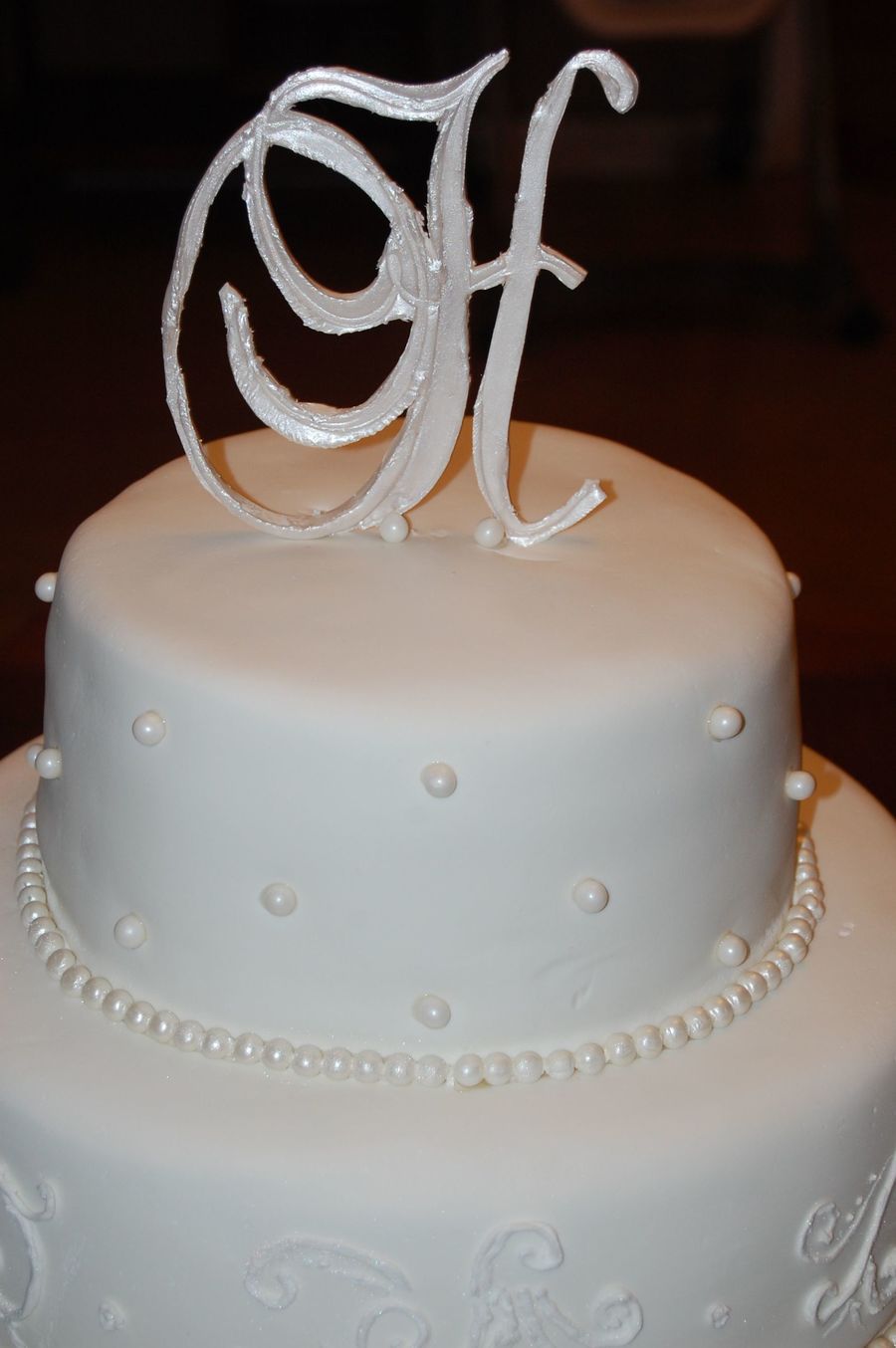 Jennifer's Dontz's white chocolate fondant and white chocolate clay pearls. WASC cake with amaretto bavarian cream filling. Handmade gumpaste topper.