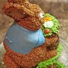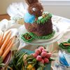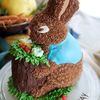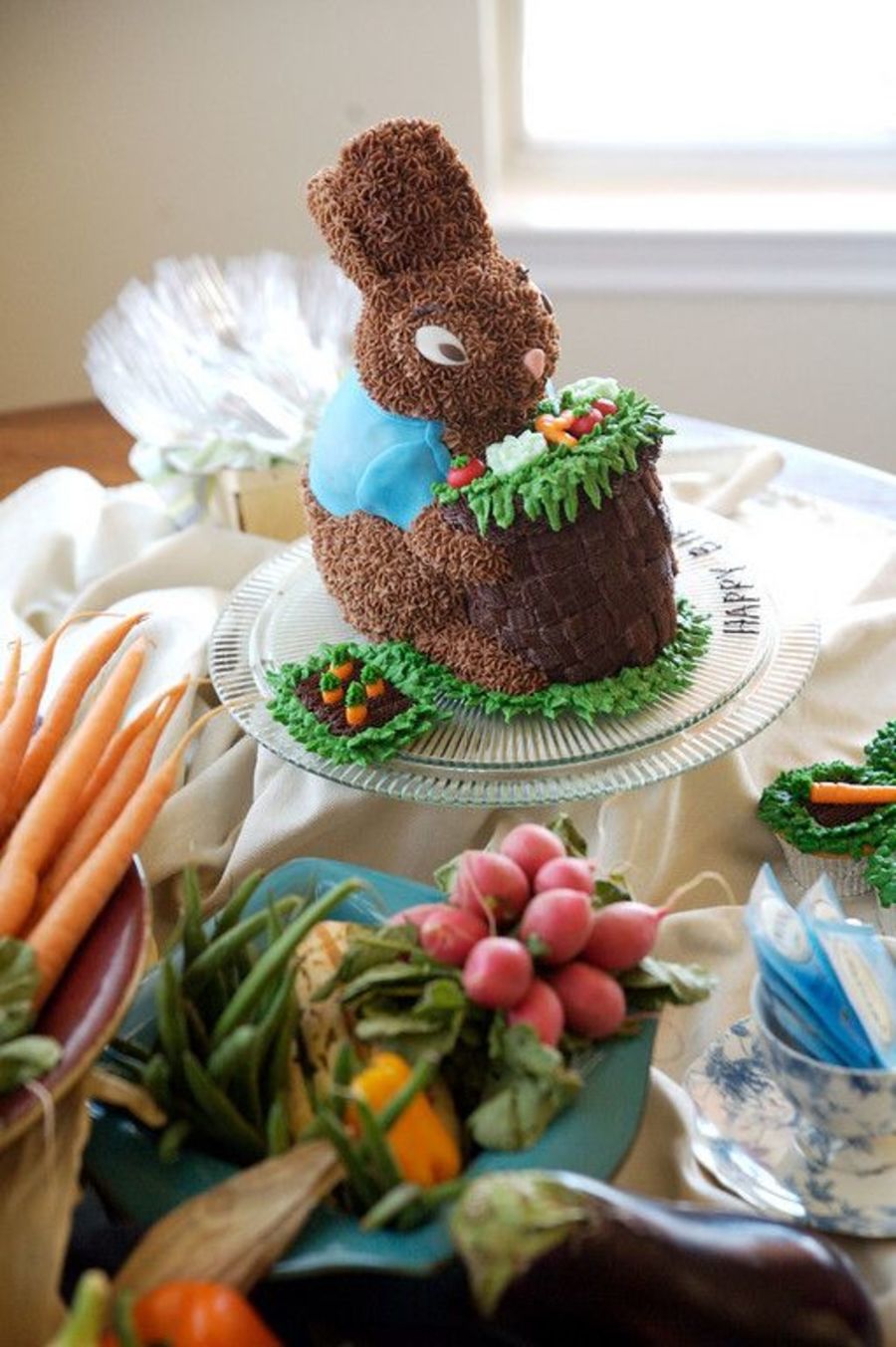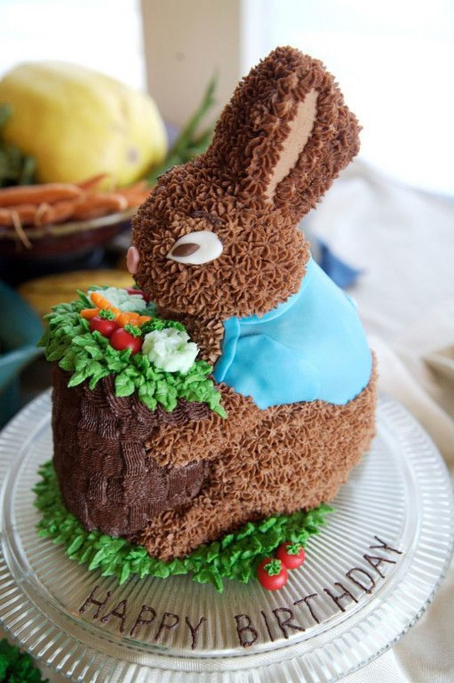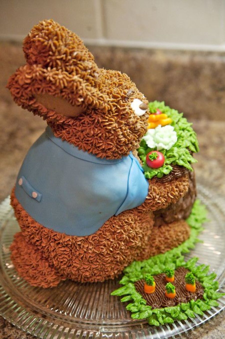 A peter rabbit cake made using the Crate and Barrell rabbit pan. Chocolate buttercream icing, with fondant accents. Piped lettuce, fondant tomatoes and carrots.