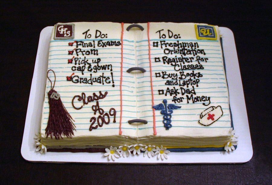 1/3 sheet cake carved slightly to resemble an open notebook: the left side dedicated to graduating high school and the right side to the college she will be attending in the fall. all buttercream except for binder rings and flowers which are fondant.
