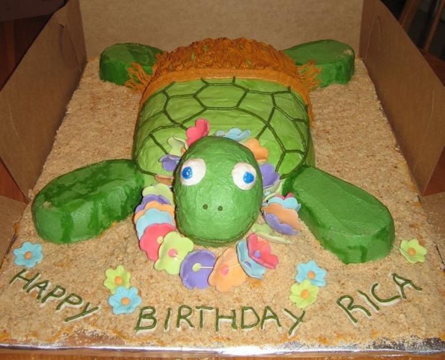 Red Velvet Cake with buttercream icing for the body, RKT covered in buttercream for the head. Lei made with fondant. Turtle is resting on a bed of "sand".