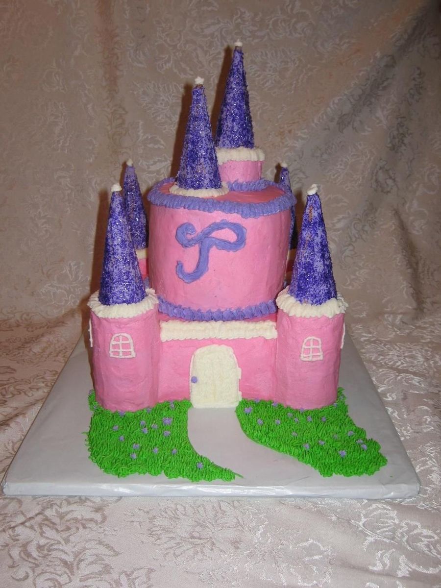 This was one of my first 3-D cakes. The whole castle and turrets are made of chocolate cake and buttercream icing. The tops of the turrets are inverted sugar cones covered in buttercream icing and edible glitter.