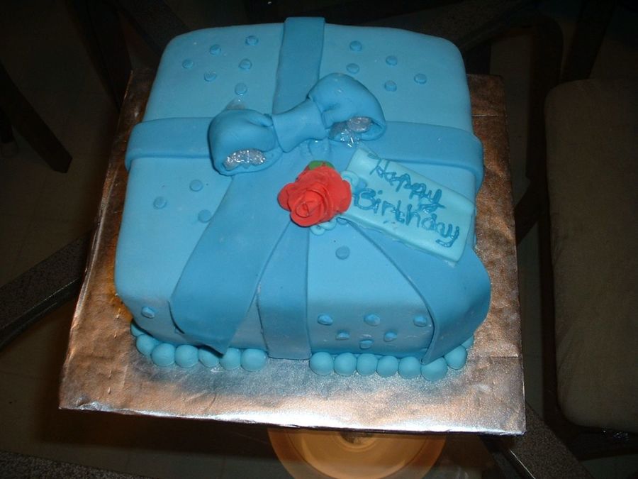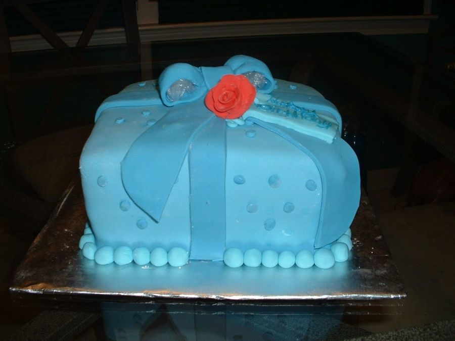 Made this cake for a co-worker's daughter's bithday she was turning 15. Chocolate cake covered in fondant with fondant bow and ribbon. Rose was made out of gumpaste/fondant mixture
