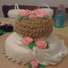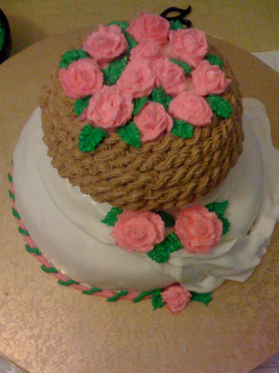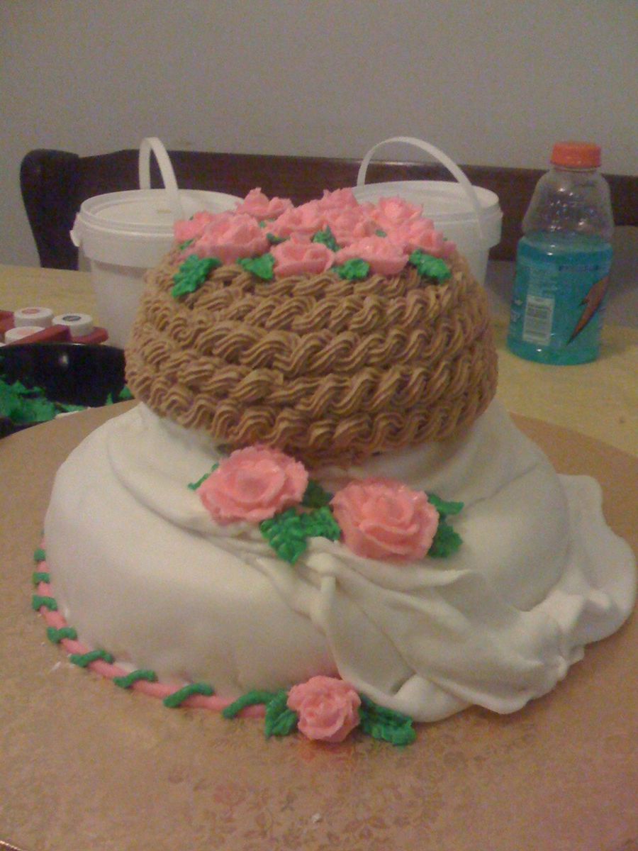 This cake was made for practice. It is bc roses and then fondant bottom and white drape.