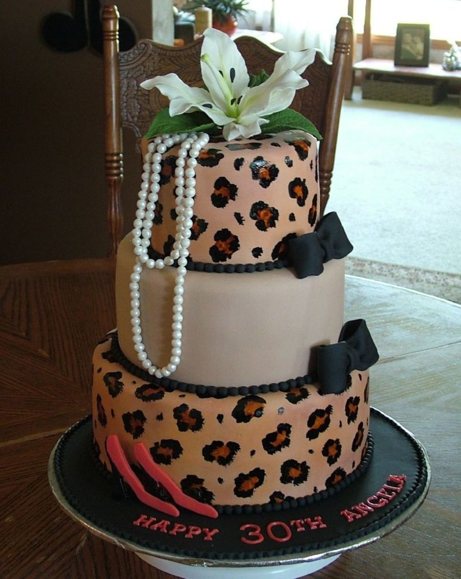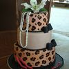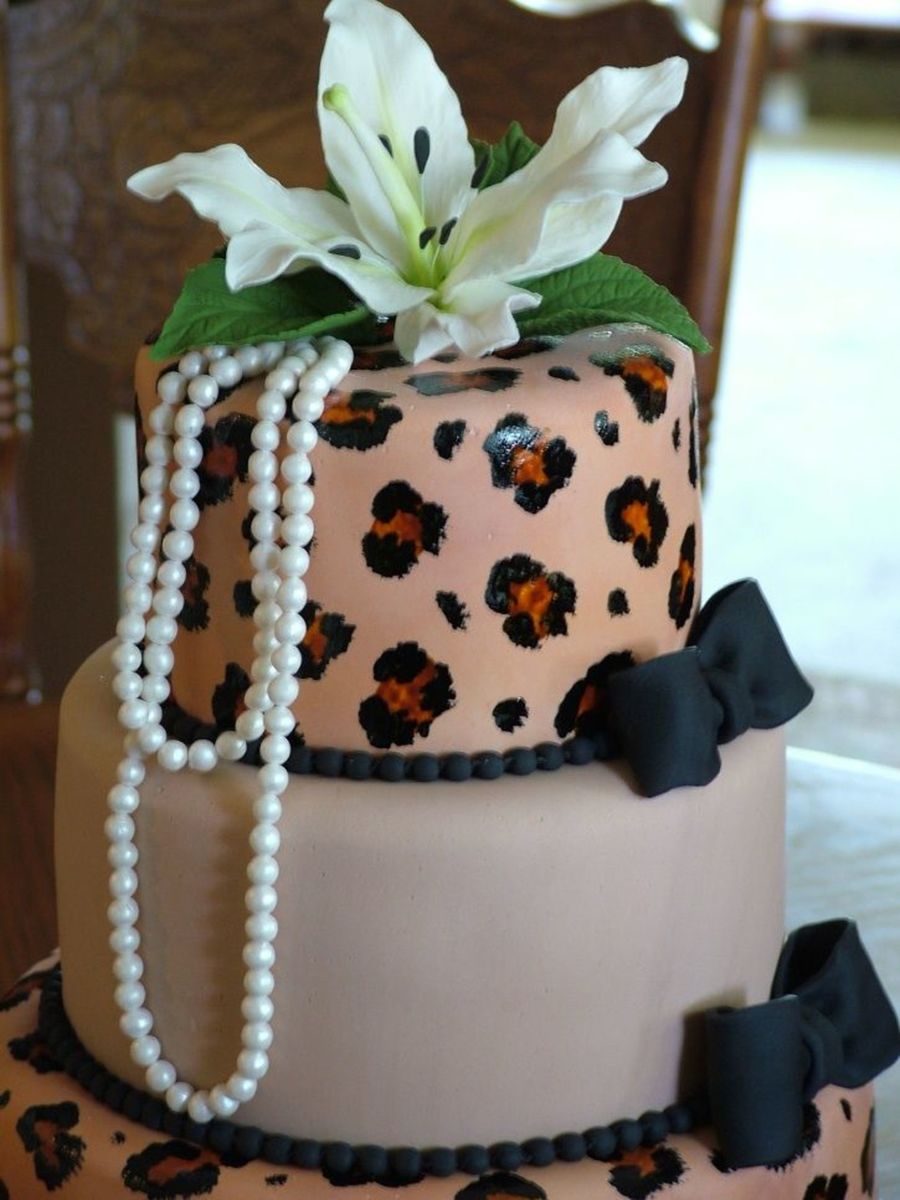 10,8,and 6" cakes .Leopard print is hand painted, cutout shoes ,gumpaste lilly, each pearl for the necklace was hand rolled,tossed in super pearl and strung on fishing line. TFL
