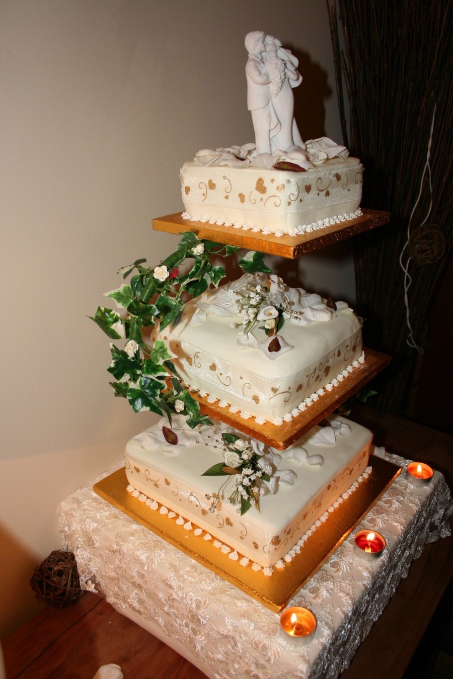This is my first attempt now at a three tier and i decorated with silk flowers and made a box stand for it to give it some height i enjoyed making this cake for my daughters wedding i know it wasn't the best cake in the world but it had a lot of love attached !!