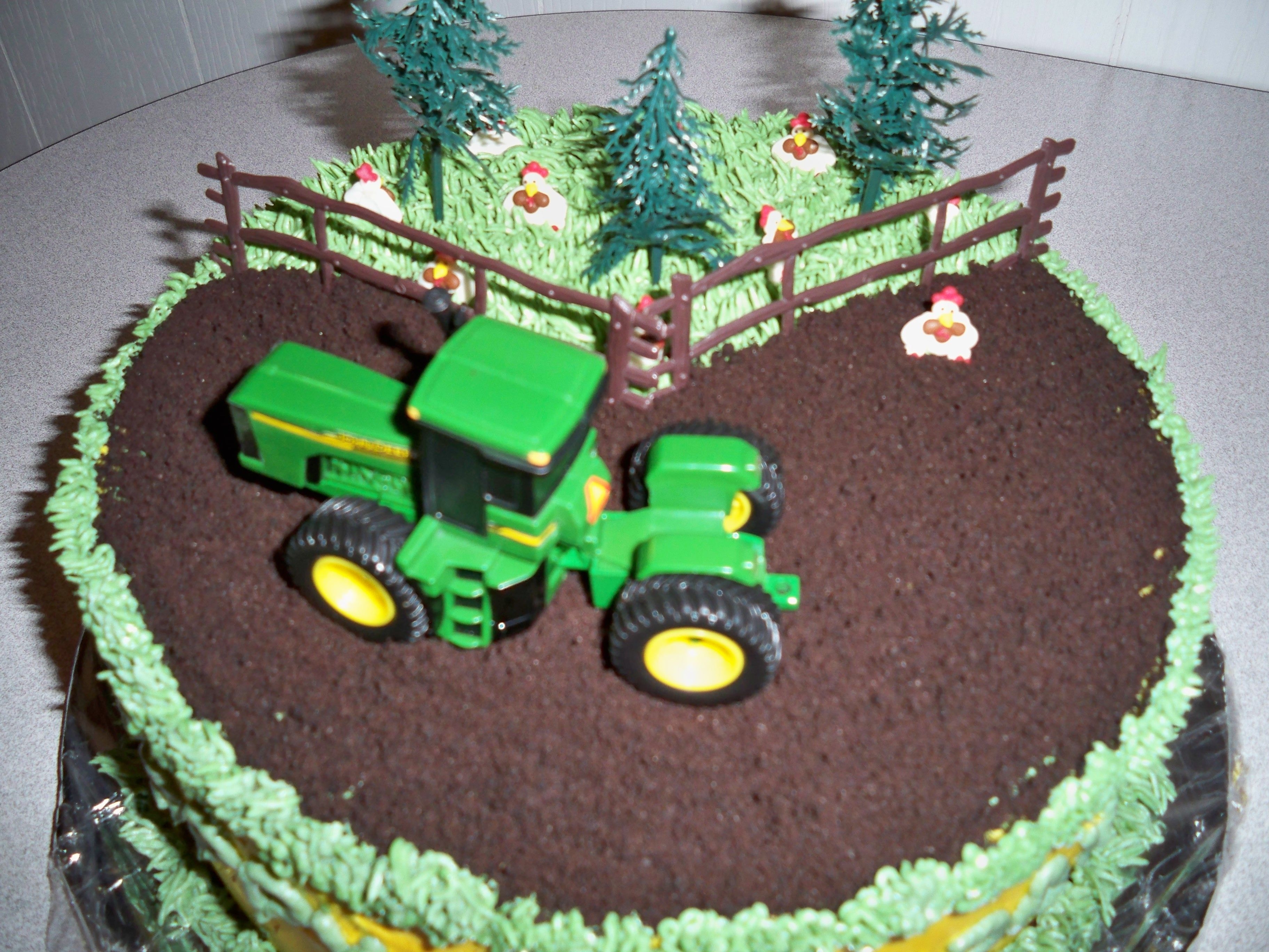 10 in. round Oreo and Cream with bc icing. "Field" is smashed oreo cookie. Chickens are sugar.