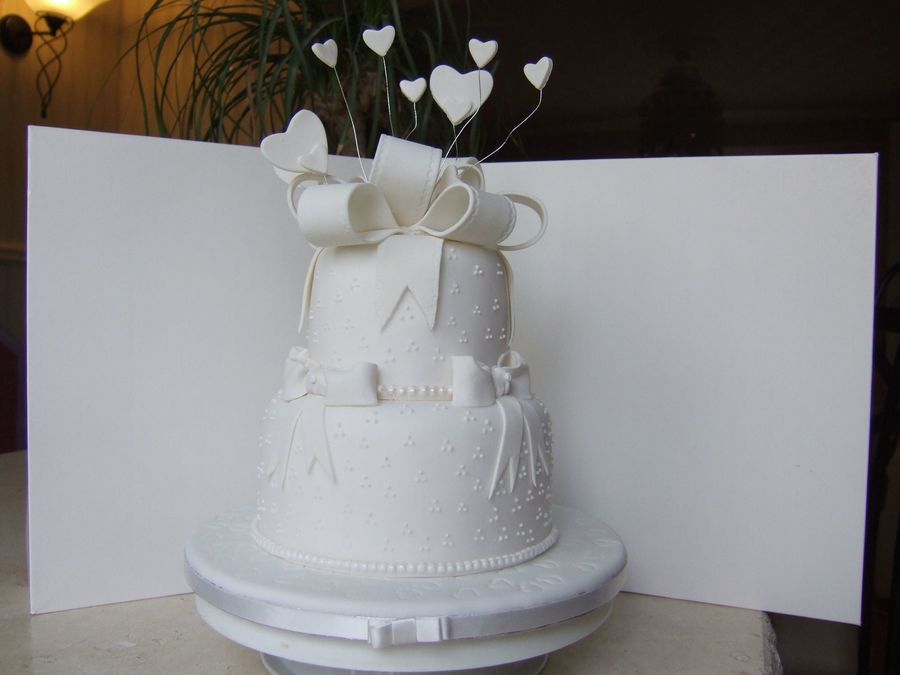 this is a dummy wedding cake we had to design a wedding cake of our choice for our class project this was my first attempt of doing a bow and the wires the bow was difficult to get right and to set was not easy i used gum paste watered down to make a sticky glue but the next bow i done on a cake i found royal icing was better to use as it blended in better with the bow when tried