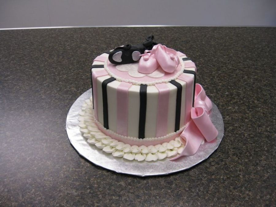 Birhday cake for a set of twin girls who obviously love to dance! Vanilla cake with strawberry filling and vanilla BC. Shoes are gumpaste and everything else is fondant. Thanks for looking!