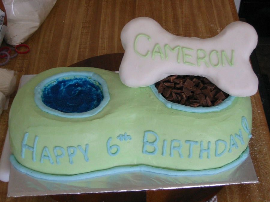 Regular cake with buttercream frosting. Fondant covered rice crispy treat for the bone, edible glitter for the water, and cut up chocolate candy melts for the food.