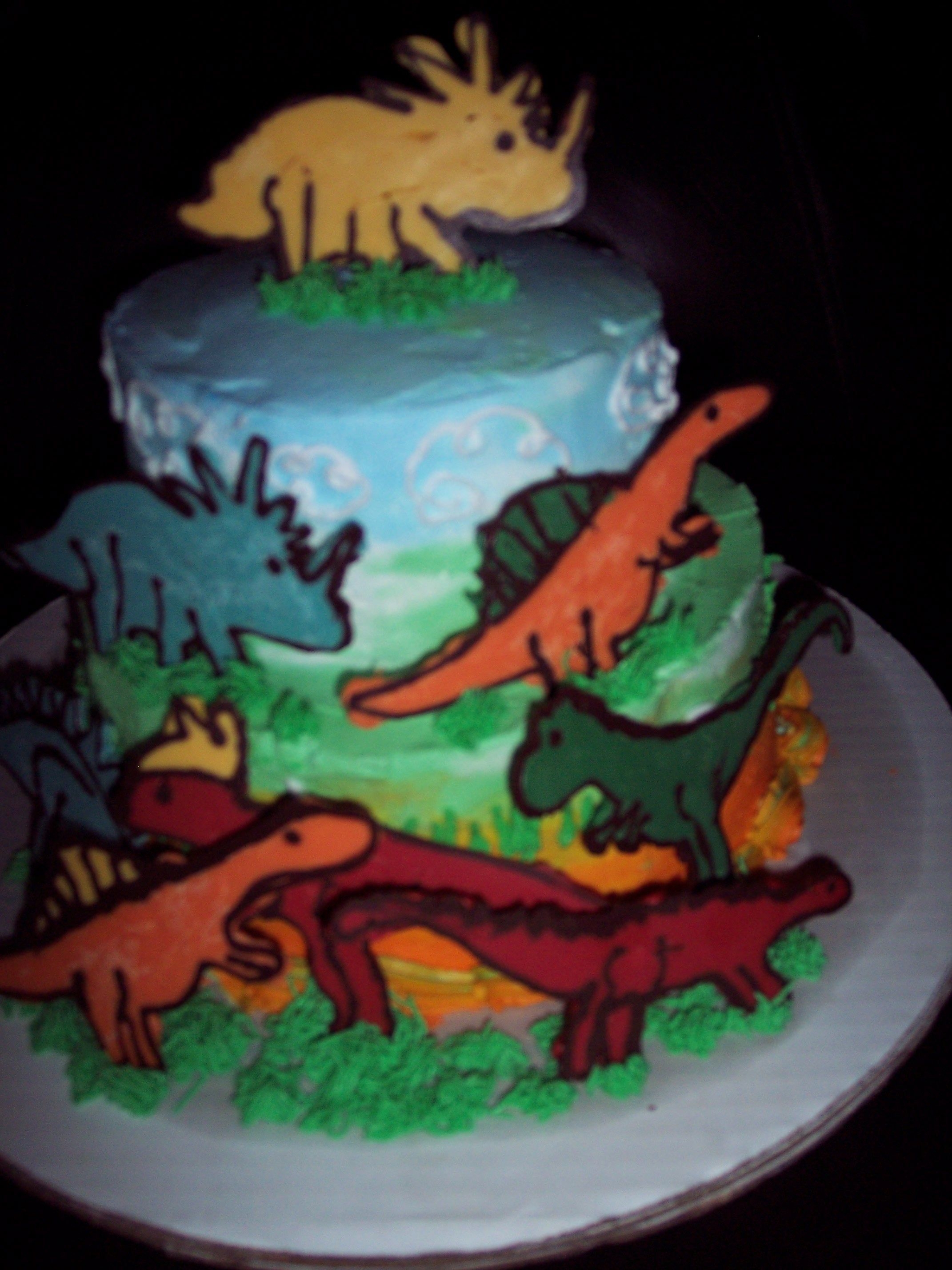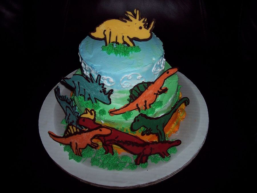 Cake is butter cream using 4 different colors to look like a land scape. Dinos are chocolate and white chocolate. This was done for a 6 year old who wanted a spinosaurous. He got 6 differnt types on this cake. I sent extras so every kid at the party could have a dino!