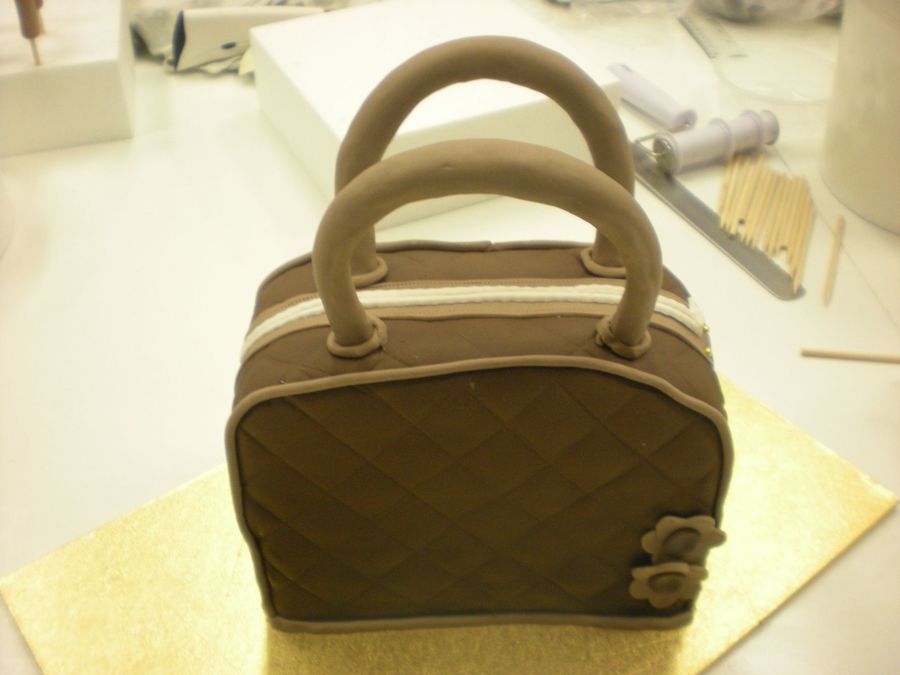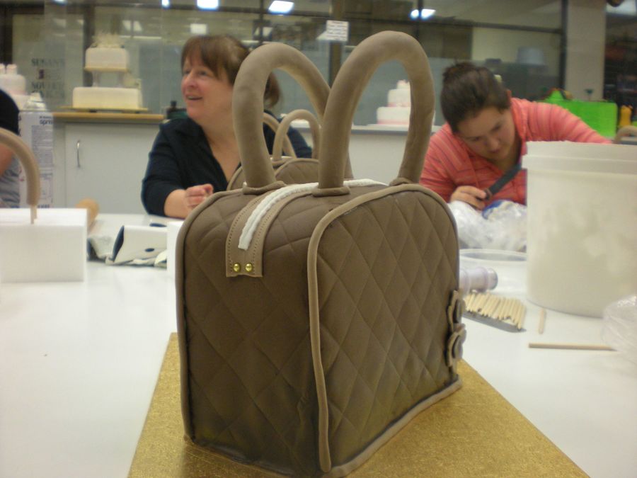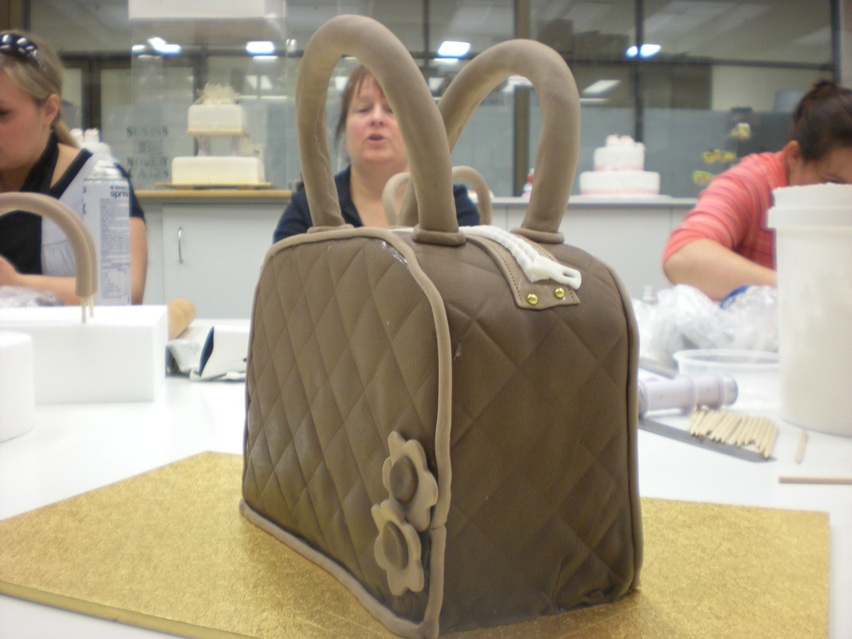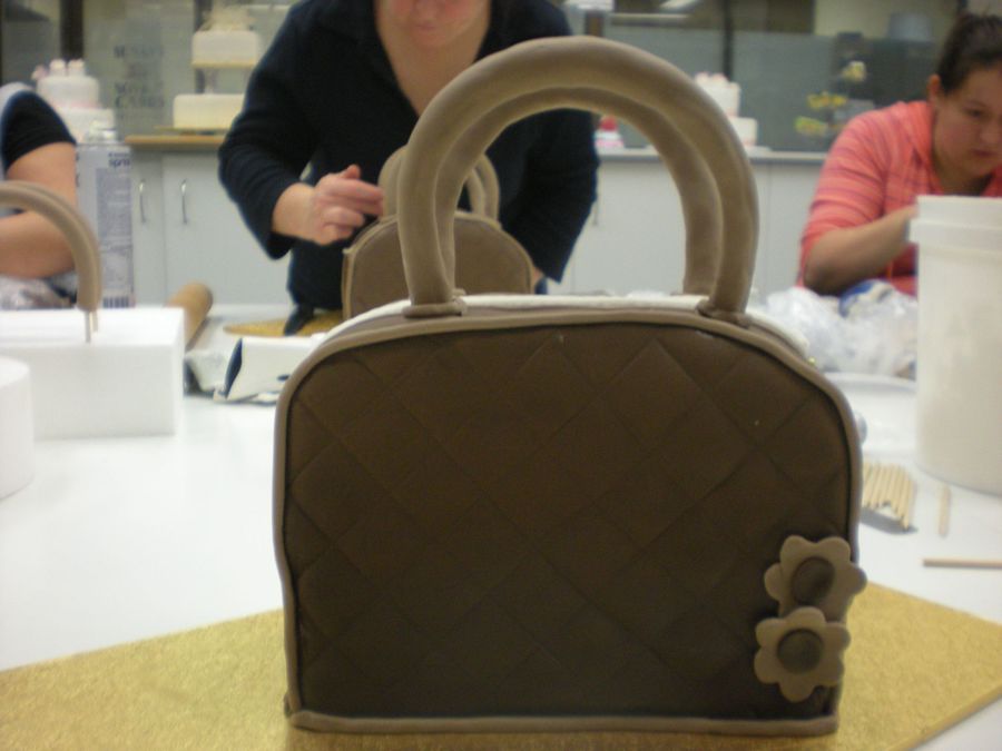 Handbag cake made in class at Greensborough Cake Decorating Centre. I think its gluten free carrot cake (they made it, I decorated it). chocolate RTR icing and accents.