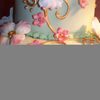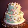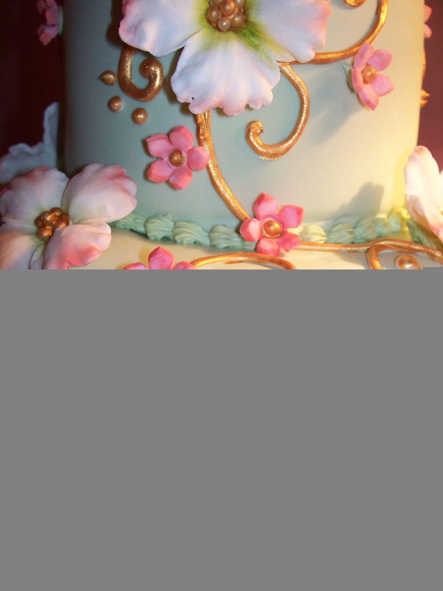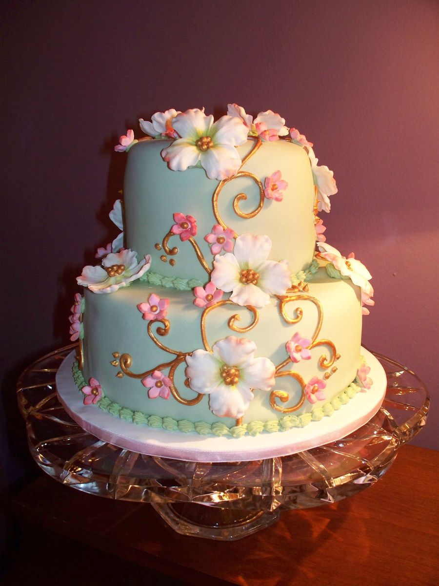 Small fondant covered wedding cake with dogwood blooms and scroll work.