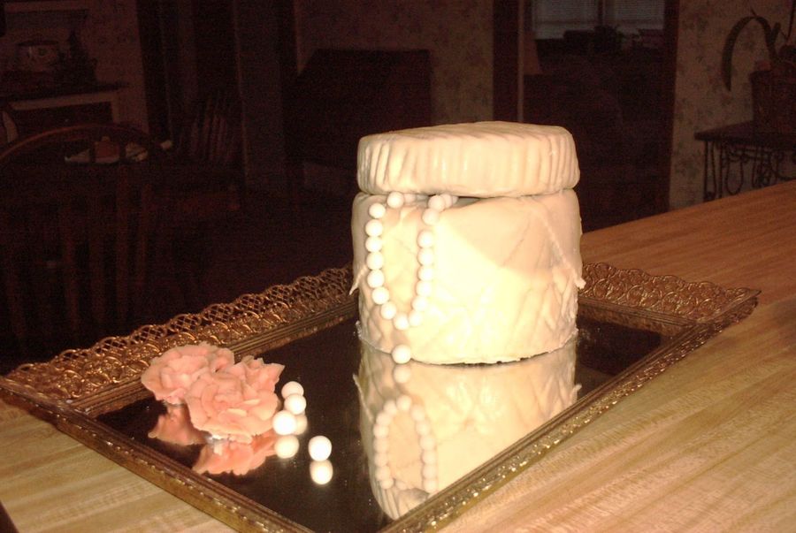 jewelry box cake with gumpaste beads displayed on vanity mirror
