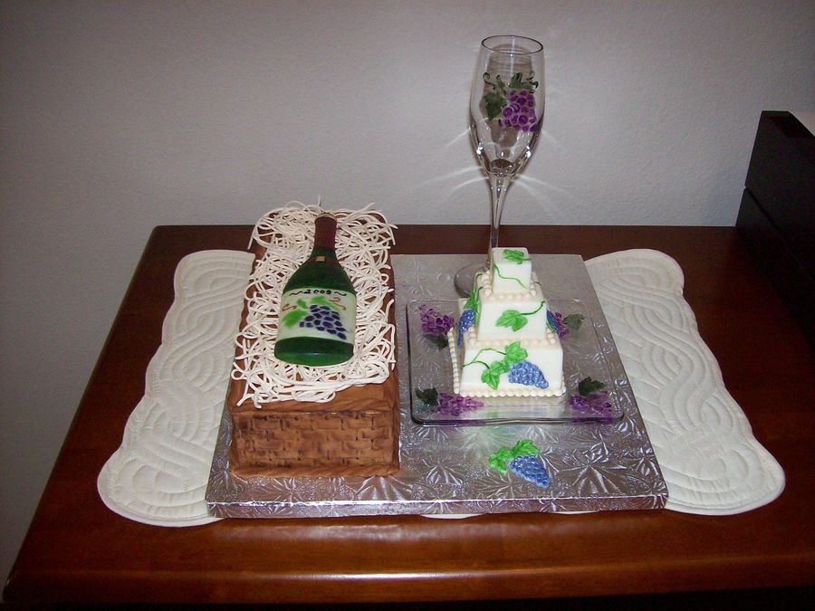 The wine bottle and basket is all fondant. The minature cake is chocolate with patchwork cutters for the grapes and I painted grapes on the wine glass and plate. TFL