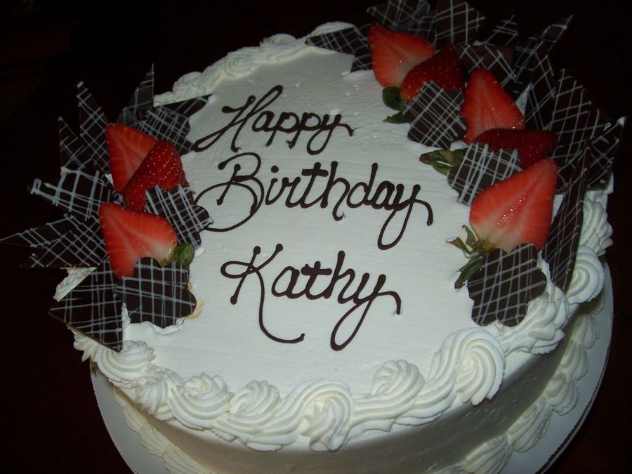 Chocolate cake, strawberry mousse filing, whip cream frosting. Detailed with cut strawberries and chocolate cut outs