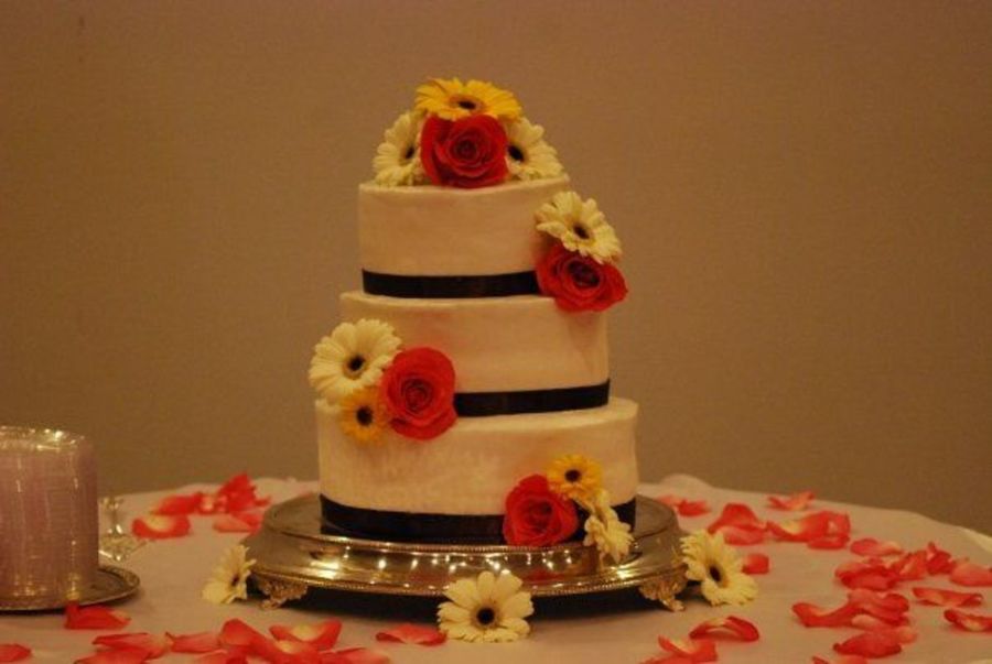 12-10-8 buttercream with brown ribbon and fresh flowers.