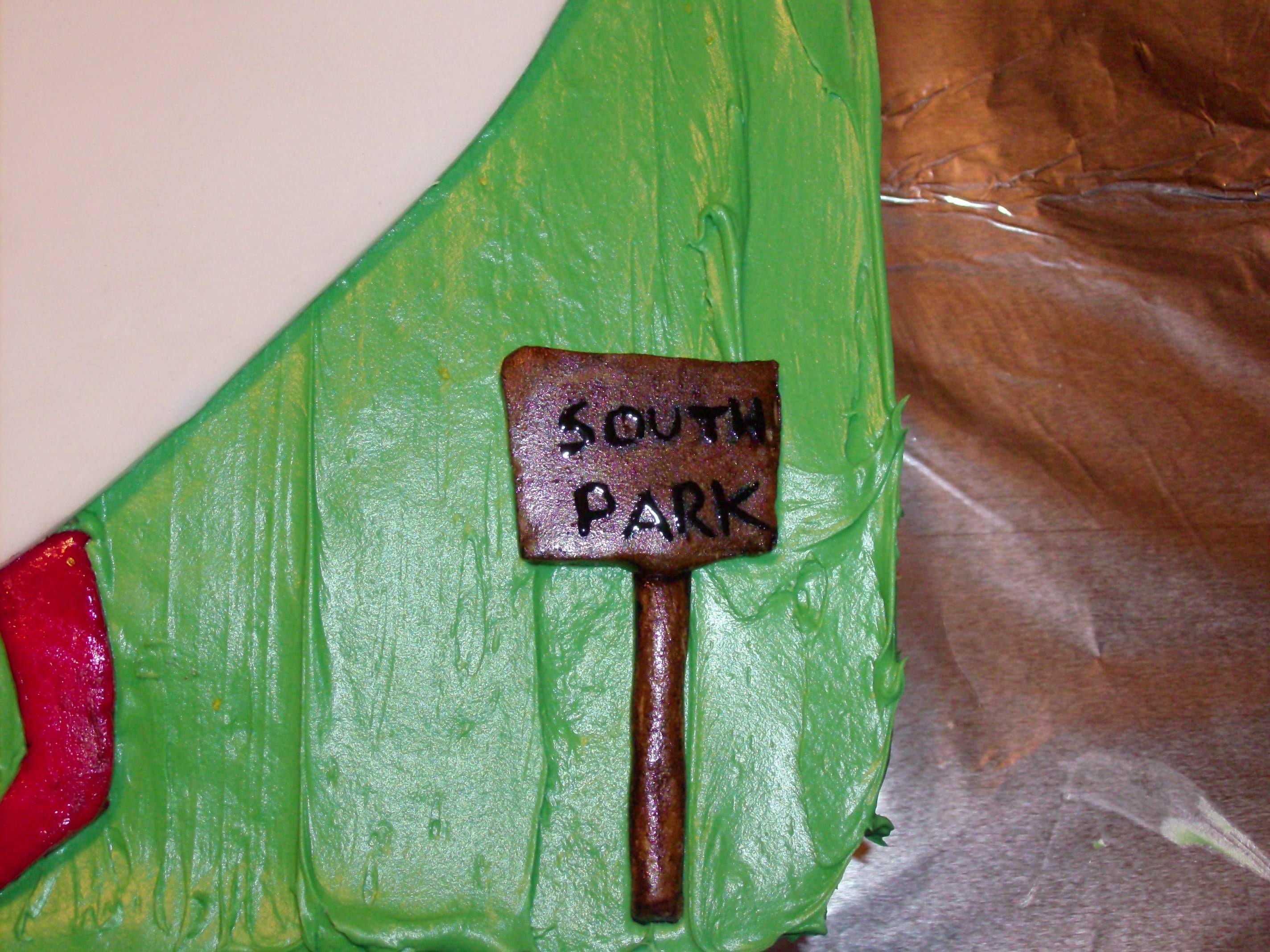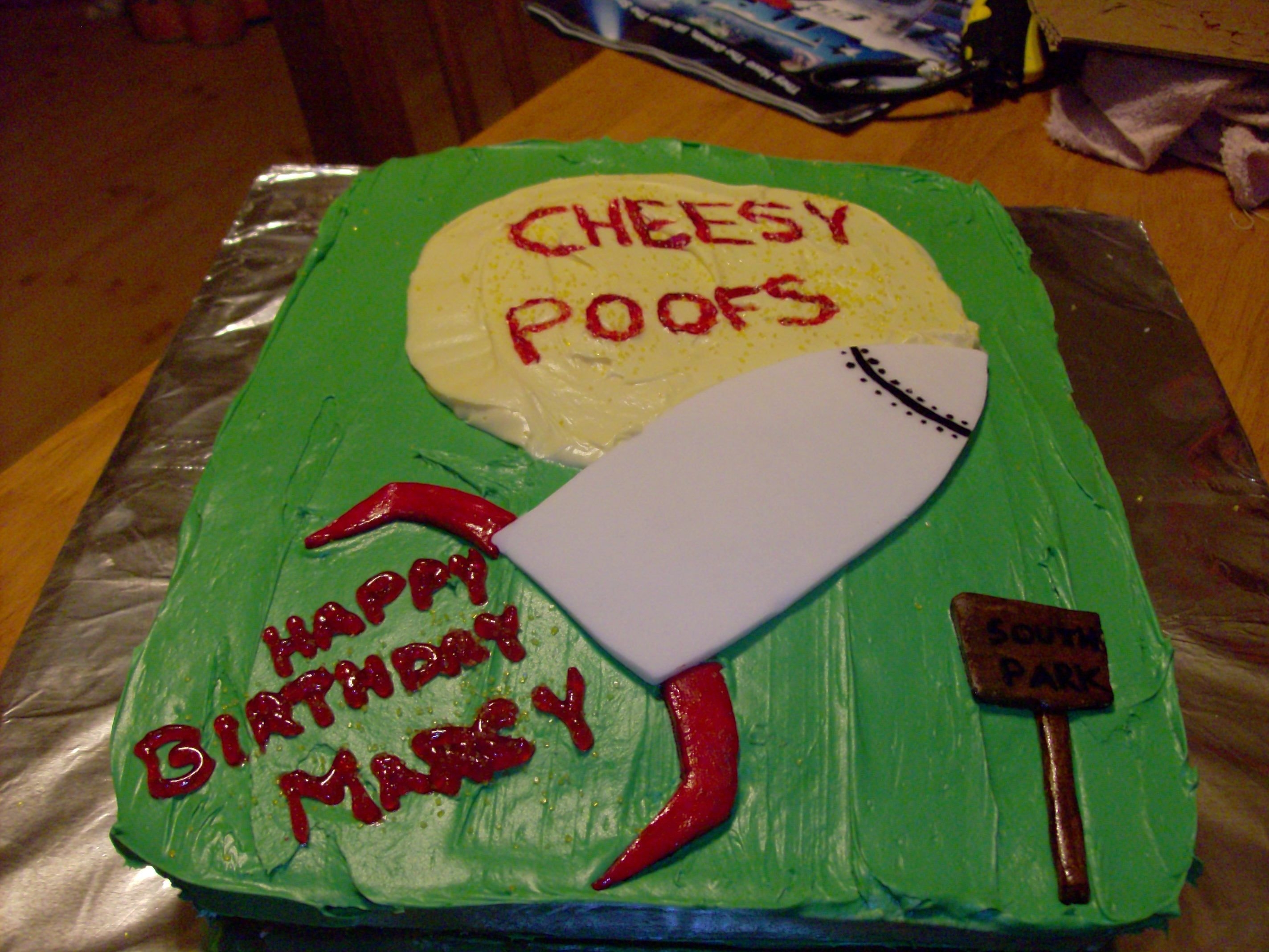 cake is an orange tinted (not flavored) vanilla cake. with green bc. the rocket and south park sign are made of fondant and hand painted. "cheesy poof" lettering was painted on with food gel coloring. this one brought out the "cartman" in me! lol