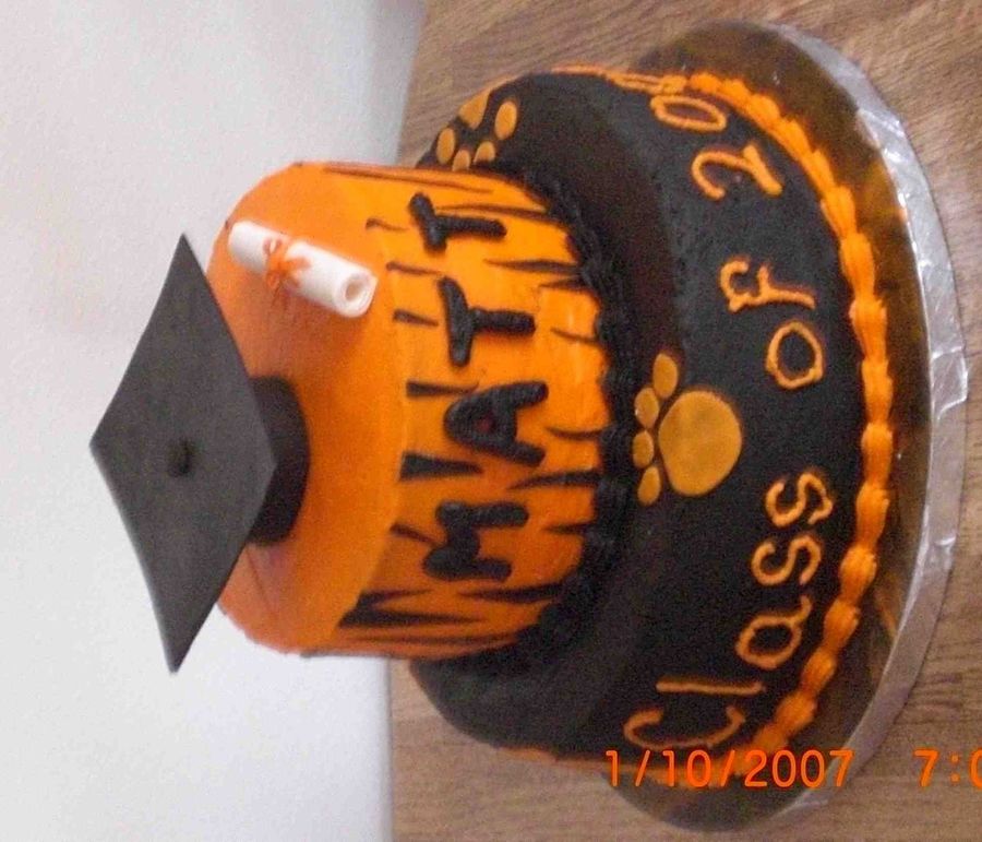 I made this for my little brother's graduation. 12" dark chocolate cake with chocolate butter cream and 8" poppy seed cake with lemon butter cream. The cap is fondant/gum paste mix. The diploma is gum paste. Stripes and paw prints are fondant. TFL!