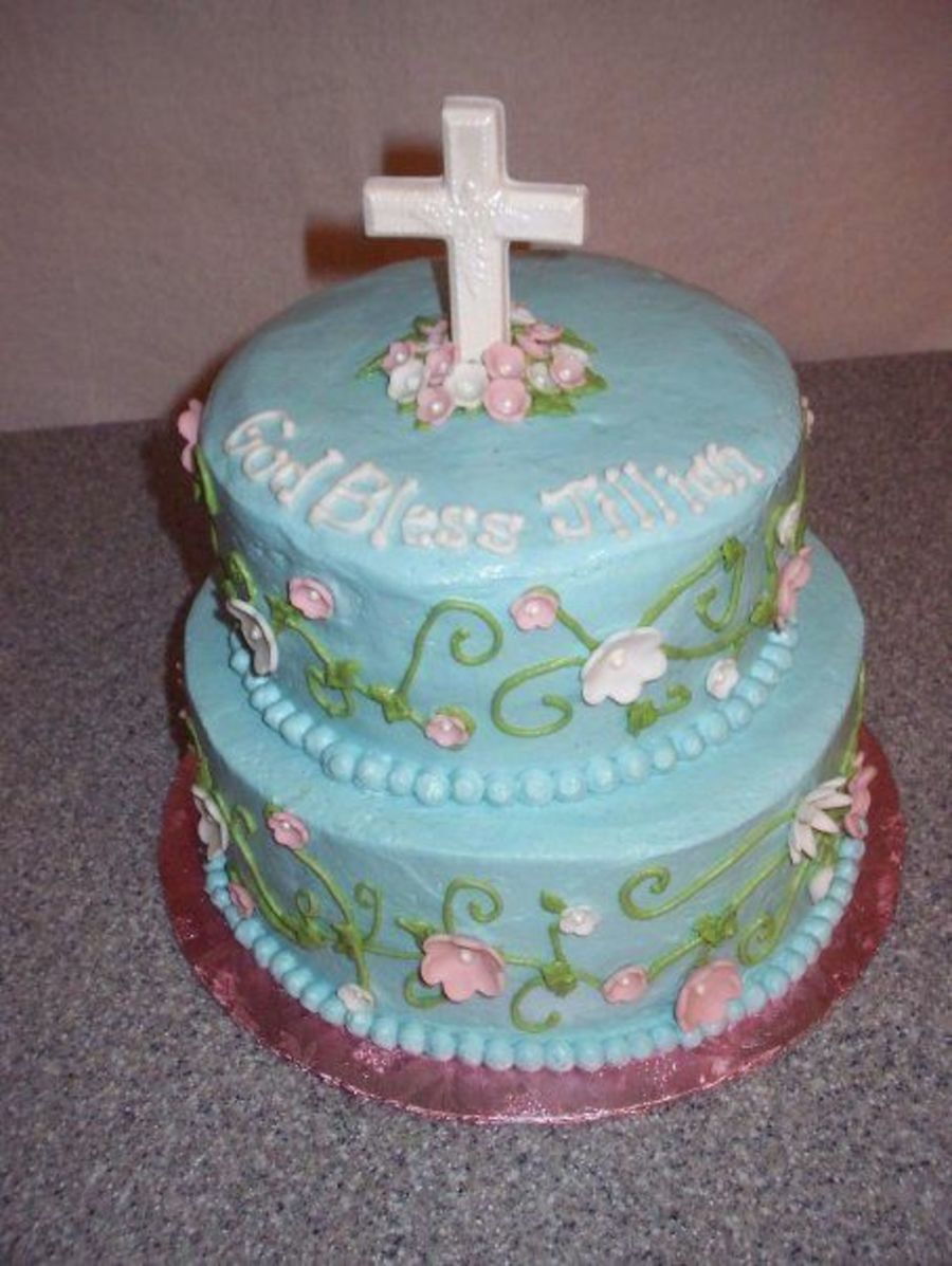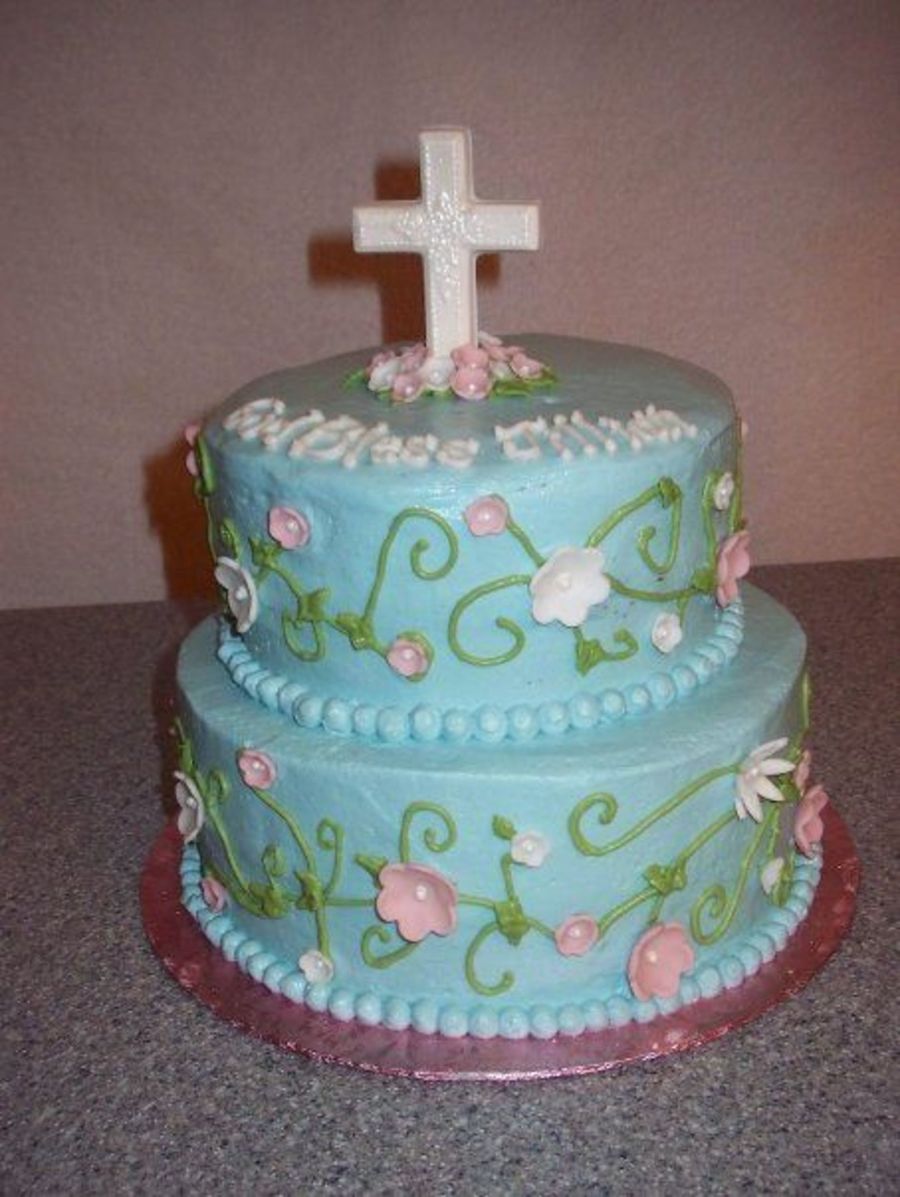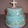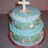 Buttercream, with fondant flowers with pearls in the middle. Cross made out of white chocolate in a sucker mold.
