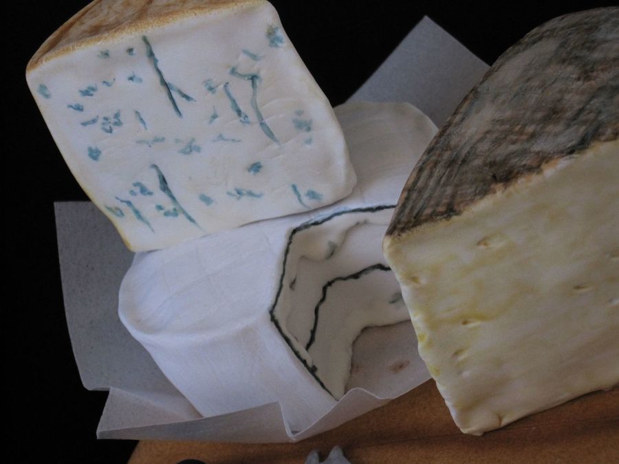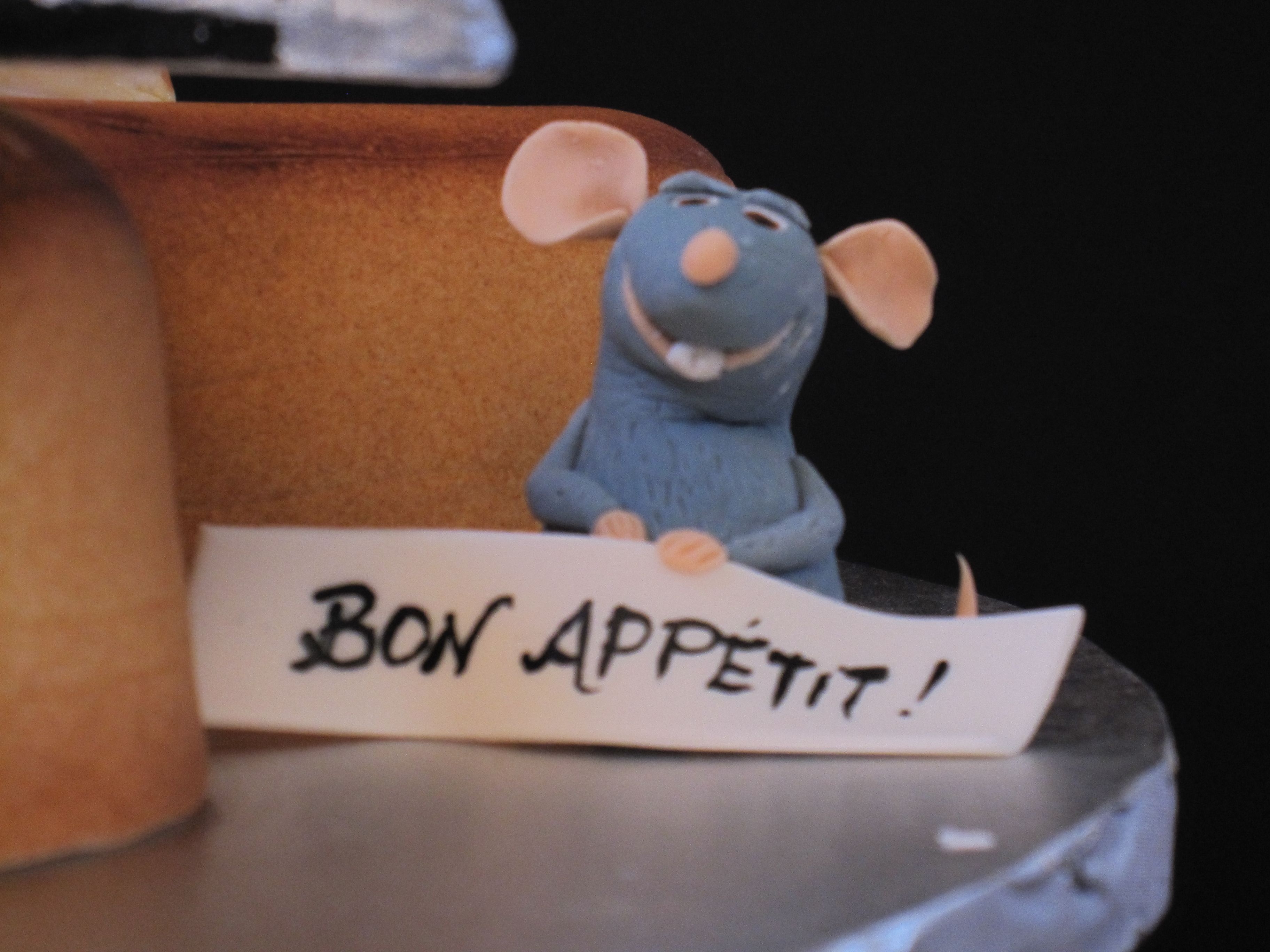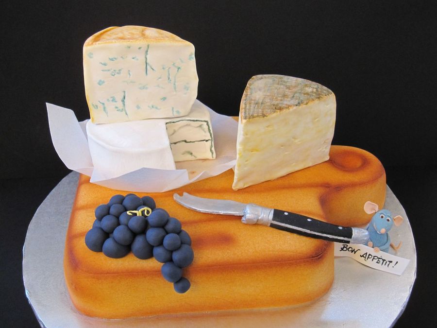 Inspired by the Maher Sisters of Chicago. Board and Cheese Cakes covered in Fondant. Grapes rolled out of fondant. Knife and Rat out of gumpaste.