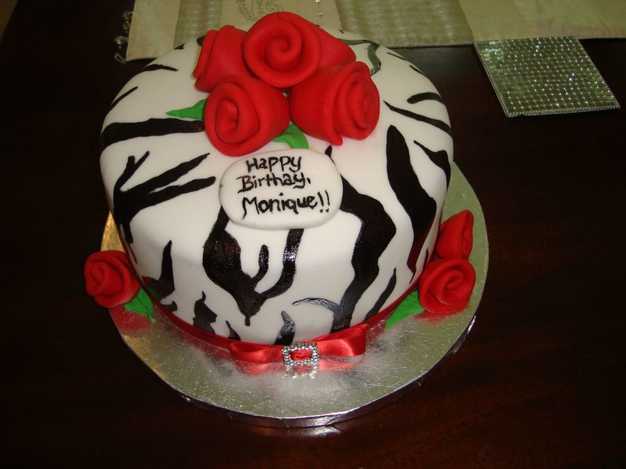8in cake covered in fondant with fondant roses. I hand painted the zebra stripes.