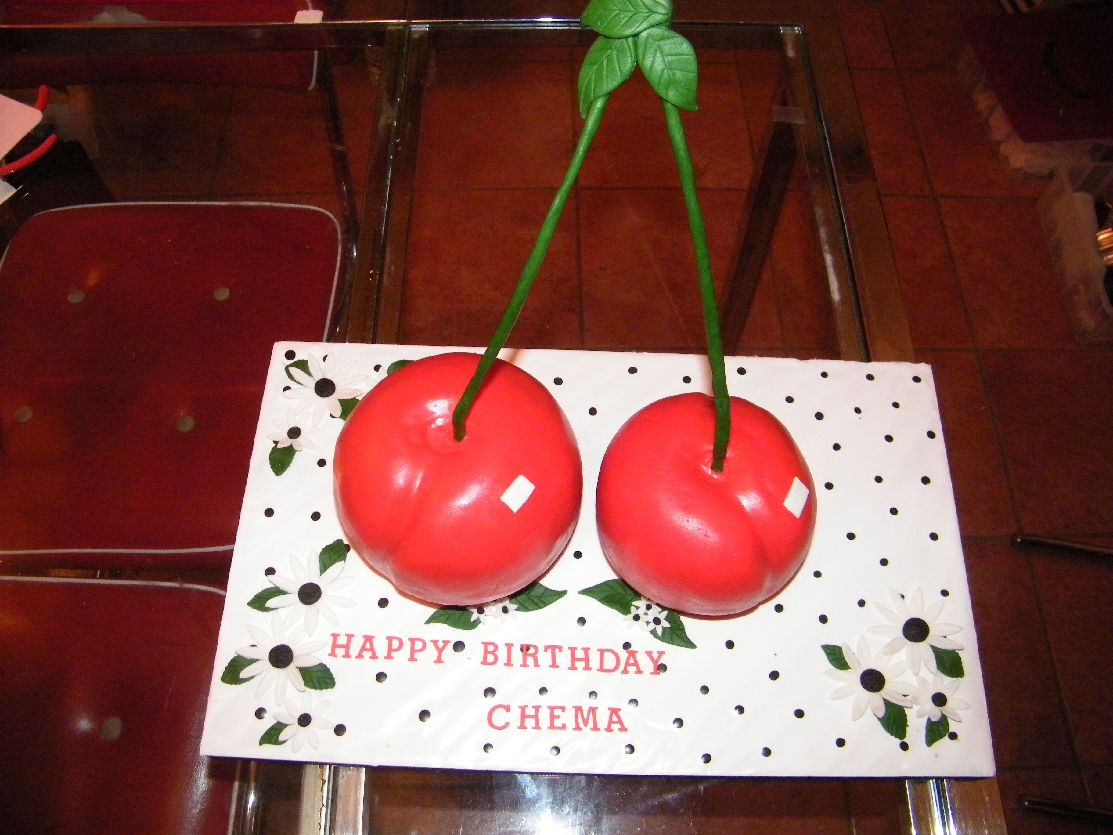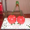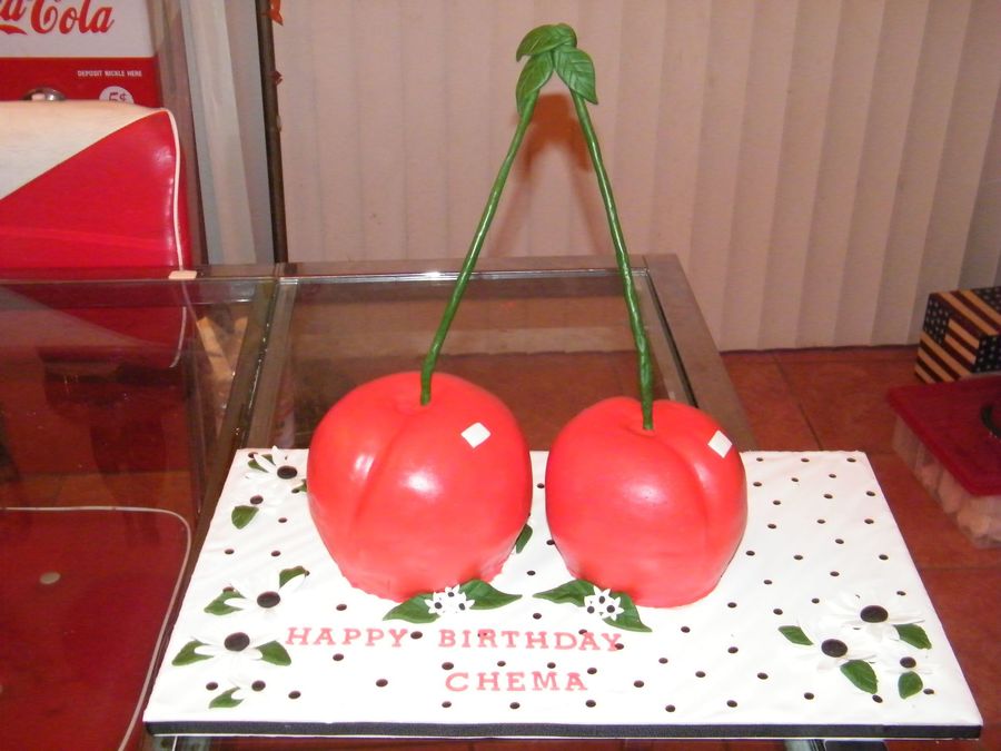 6" Wasc and 5" cakes carved to resemble 2 cherries on a stem. Covered in MMF and filled with strawberry buttercream