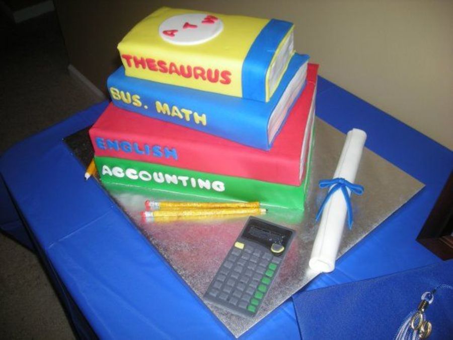 Chocolate and vanilla cake with vanilla buttercream. All books covered in fondant. Diploma and calculator made of fondant. Pencils made from gumpaste.