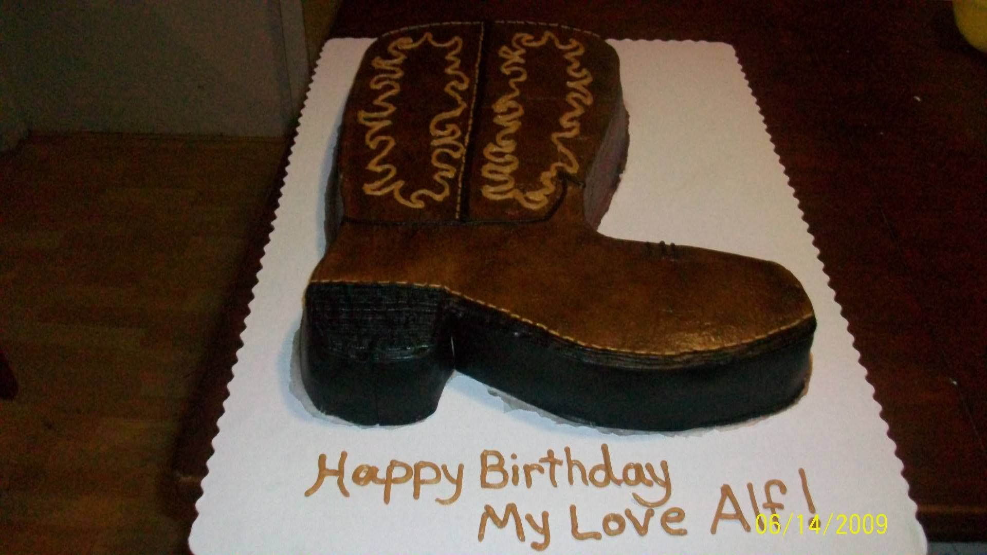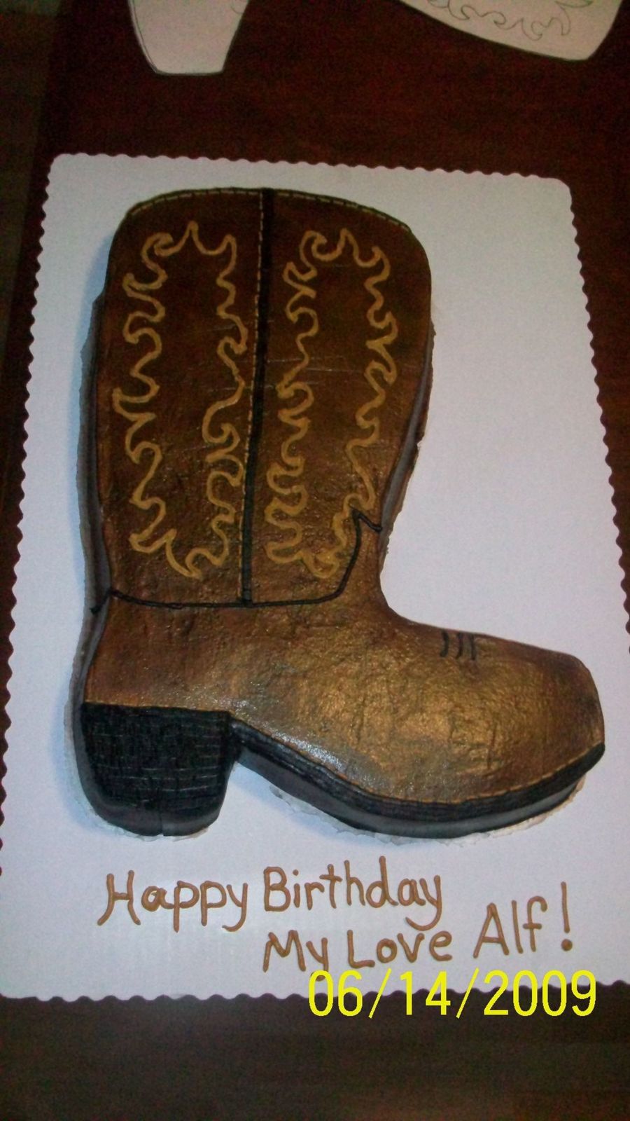 This is my first carved cake!!! I am so excited with how it came out...I was really nervous about doing this cake. It's carved from a full sheet, buttercream icing, fondant on bottom of boot. Airbrushed brown. TFL!!