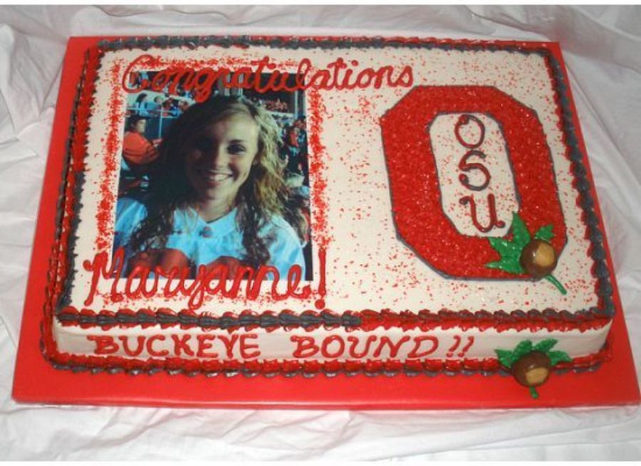 High school Grad cake for a girl attending Ohio State in the fall. All white cake iced in BC with Edible Image and candy buckeyes.