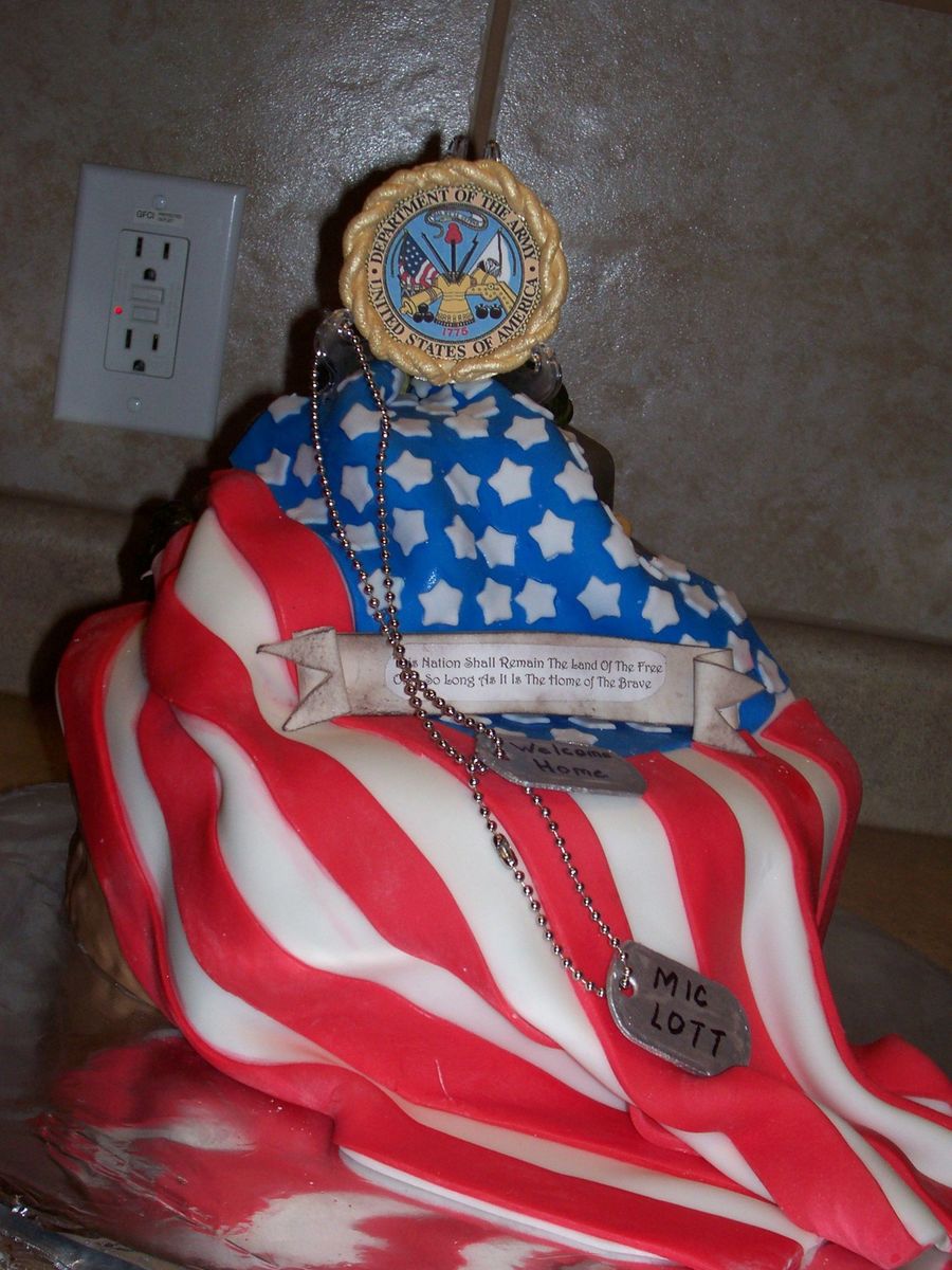Thank you mj26 for the inspiration for this cake. This was a cake made for a returning soldier. The cake is covered in buttercream then fondant. The flag and sandbags are fondant, the banner and Army Seal are edible images on gum paste.