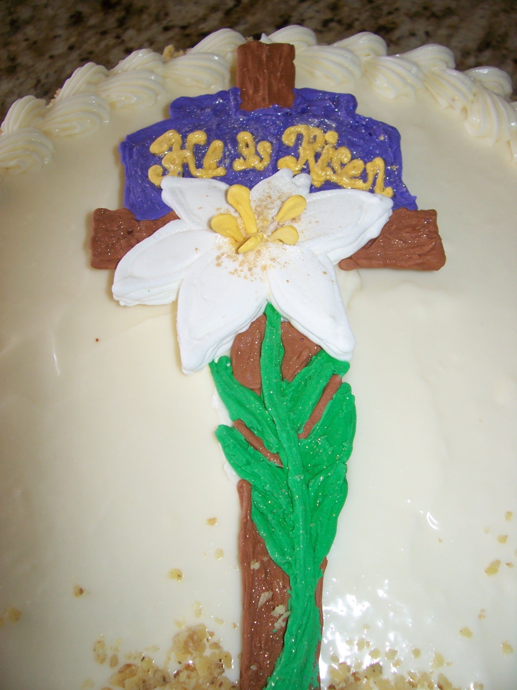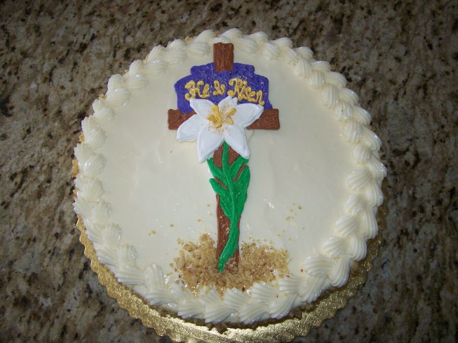Carrot Cake fill and frosted with cream cheese icing. Cross was made from tracing picture over plastic wrap and using royal icing