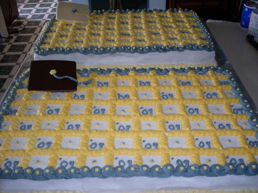I made these cakes with buttercream icing and melted some dark and white chocolate and put it in a plastic-sandwhich keeper to make the caps. Our cake cutter appreciated the lines so that she knew how big to make the pieces.