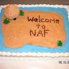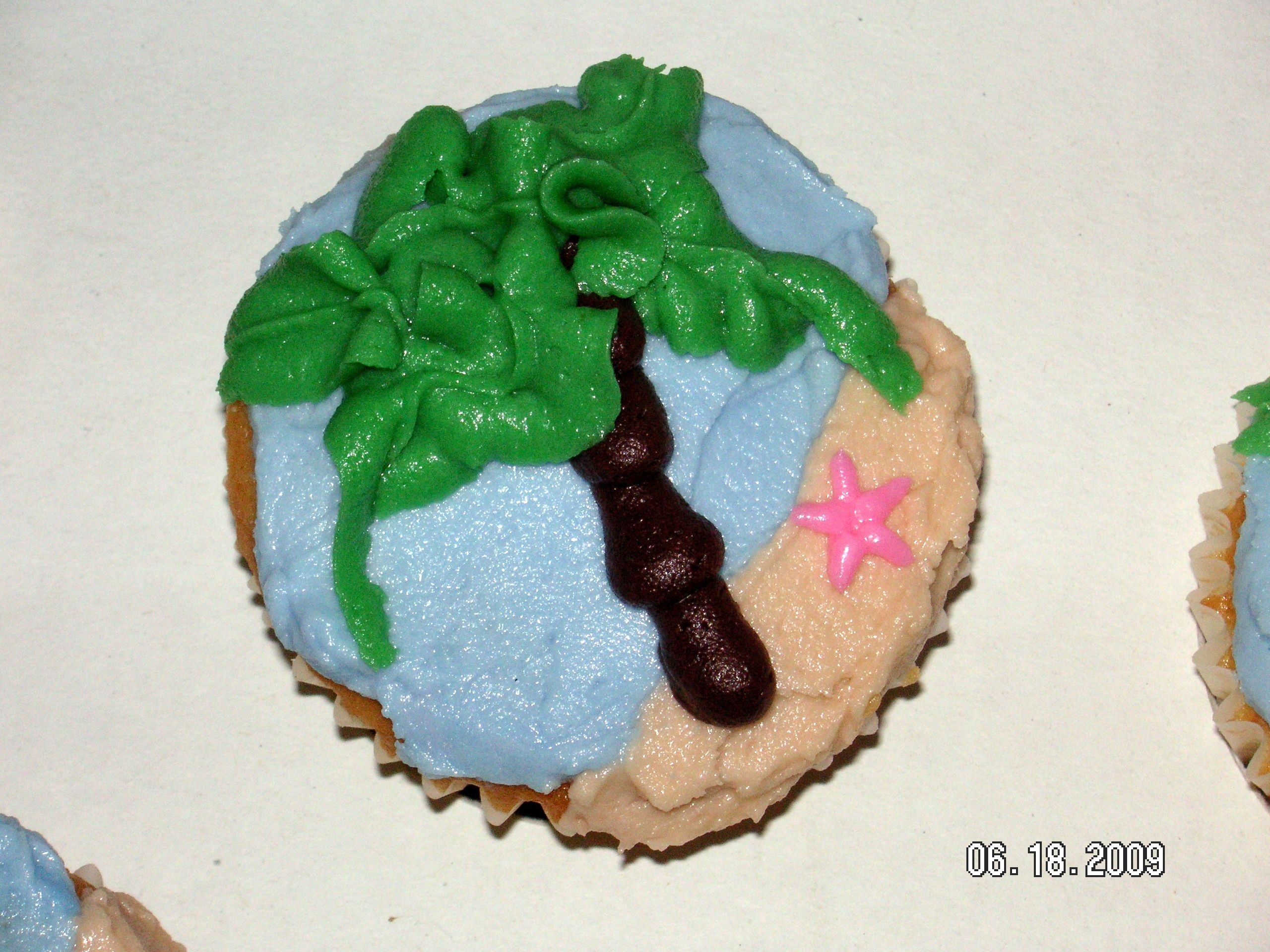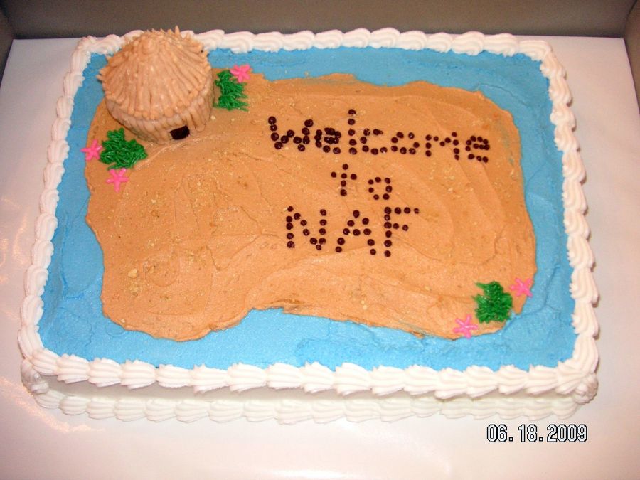 I spelled out the message so it looked like rocks on the beach of a desert island. This was made for someone throwing a luau party for her husband's change of command. They have a toy jet to "crash" on the beach as well. Made the cupcakes to coordinate. Thanks to cakeyladey for the cupcake design and to mmw1445 for the hut idea!