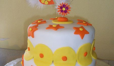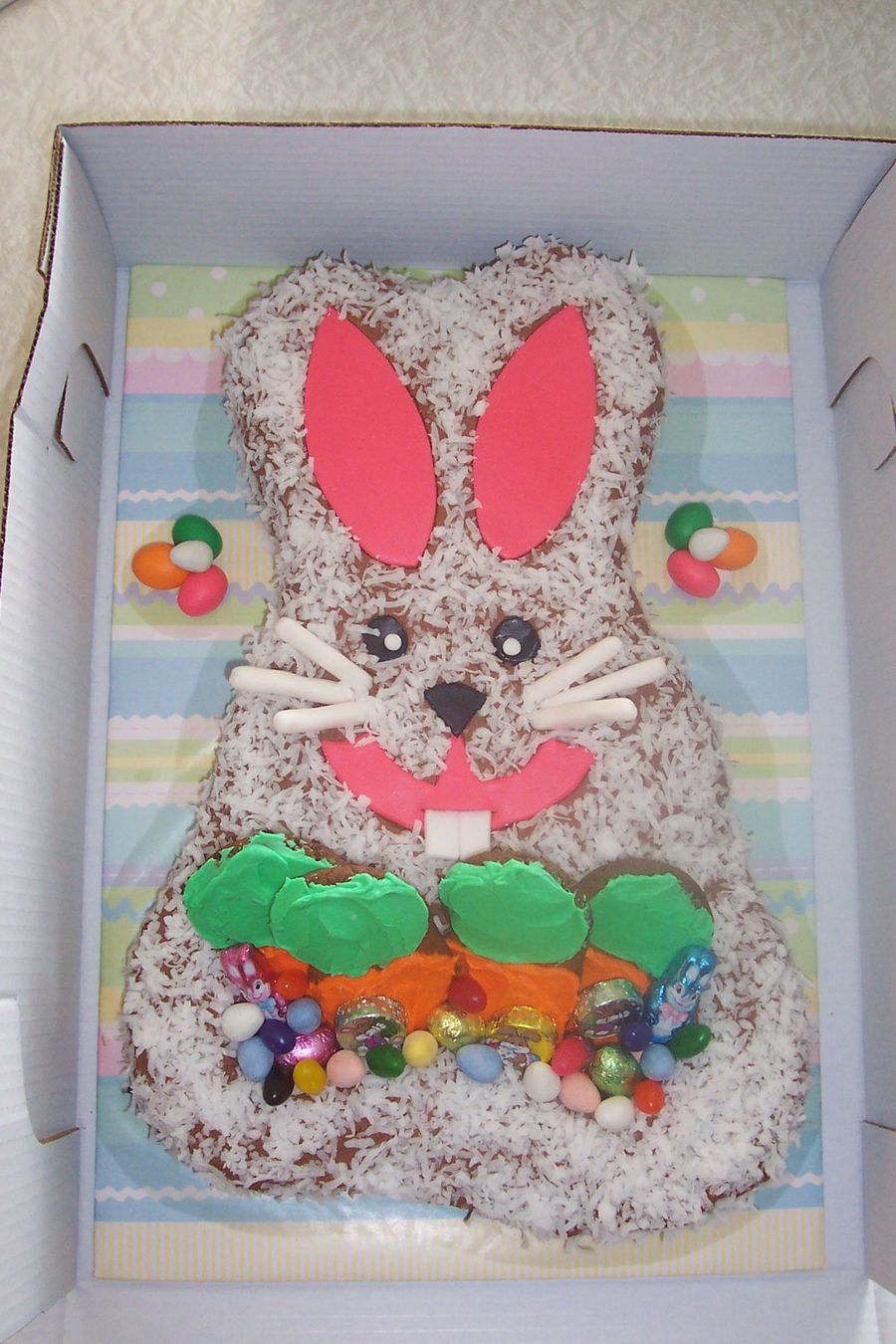 This is a devils food cake with chocolate buttercream icing. The coconut was added for fur affect. Fondant for face, whiskers, ears, and teeth. The arms are fondant also just covered with icing. We made the carrots with peanut butter cookies and added misc. easter candy. The eggs around the cake are fondant also. My only regret was the paper....my mother in law liked the paper but it was regular wrapping paper so the shortening in the icing started to "bleed" onto the paper.