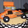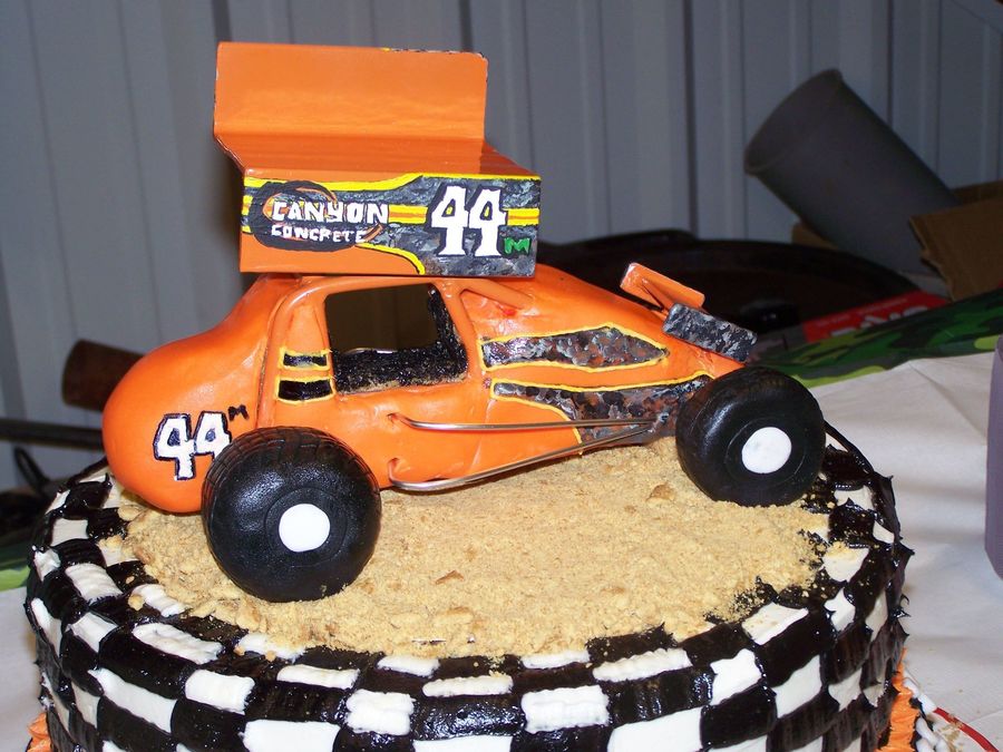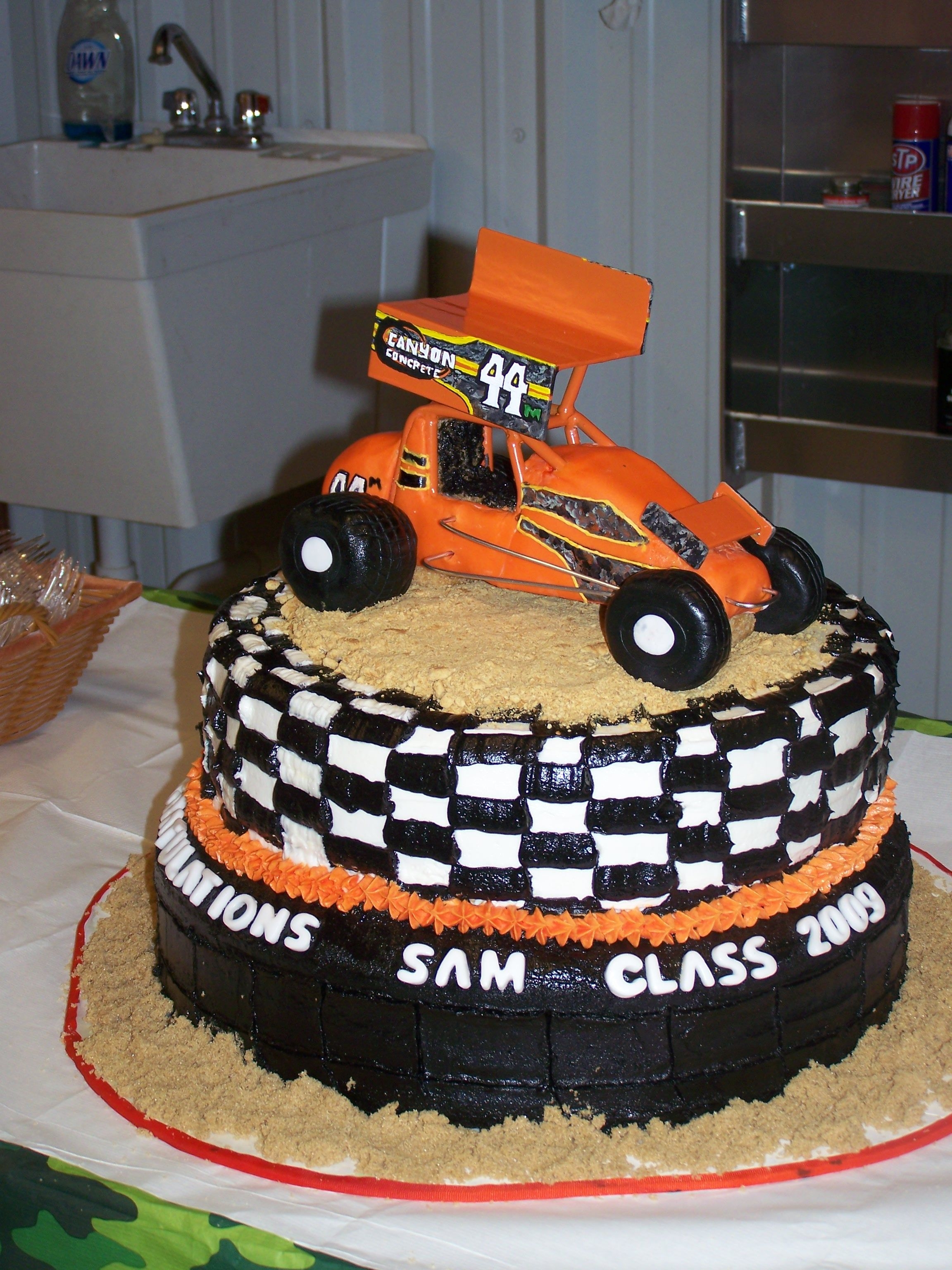 Graduation cake with fondant sprint car. the spint car is made out of rice krispy and was inspired by the clients real car . BC tire and checkered tier. needed to serve 150 people. The black gave me fits.