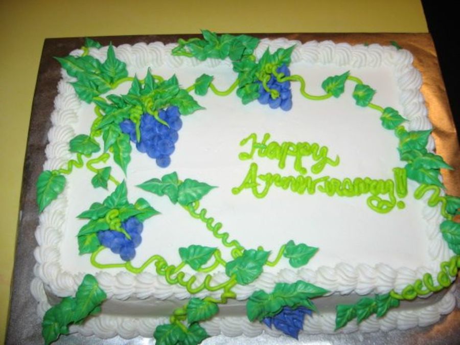 THIS WAS AN ANNIVERSARY CAKE FOR SOME FRIENDS. WHITE CAKE W/ BUTTERCREAM ICING. THEY WERE HAVING AN ITALIAN DINNER SO I THOUGHT OF GRAPES!! THEY REALLY LIKED IT. I WAS JUST HAPPY THAT IT TURNED OUT WELL. AS YOU CAN TELL I DON'T PIPE LETTERS WELL AT ALL. INFACT IF I CAN AVOID I WILL :-)