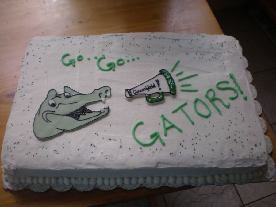 Vanilla Buttermilk cake with buttercream. Fondant/gumpaste decorations. School mascot is a Gator. TFL.