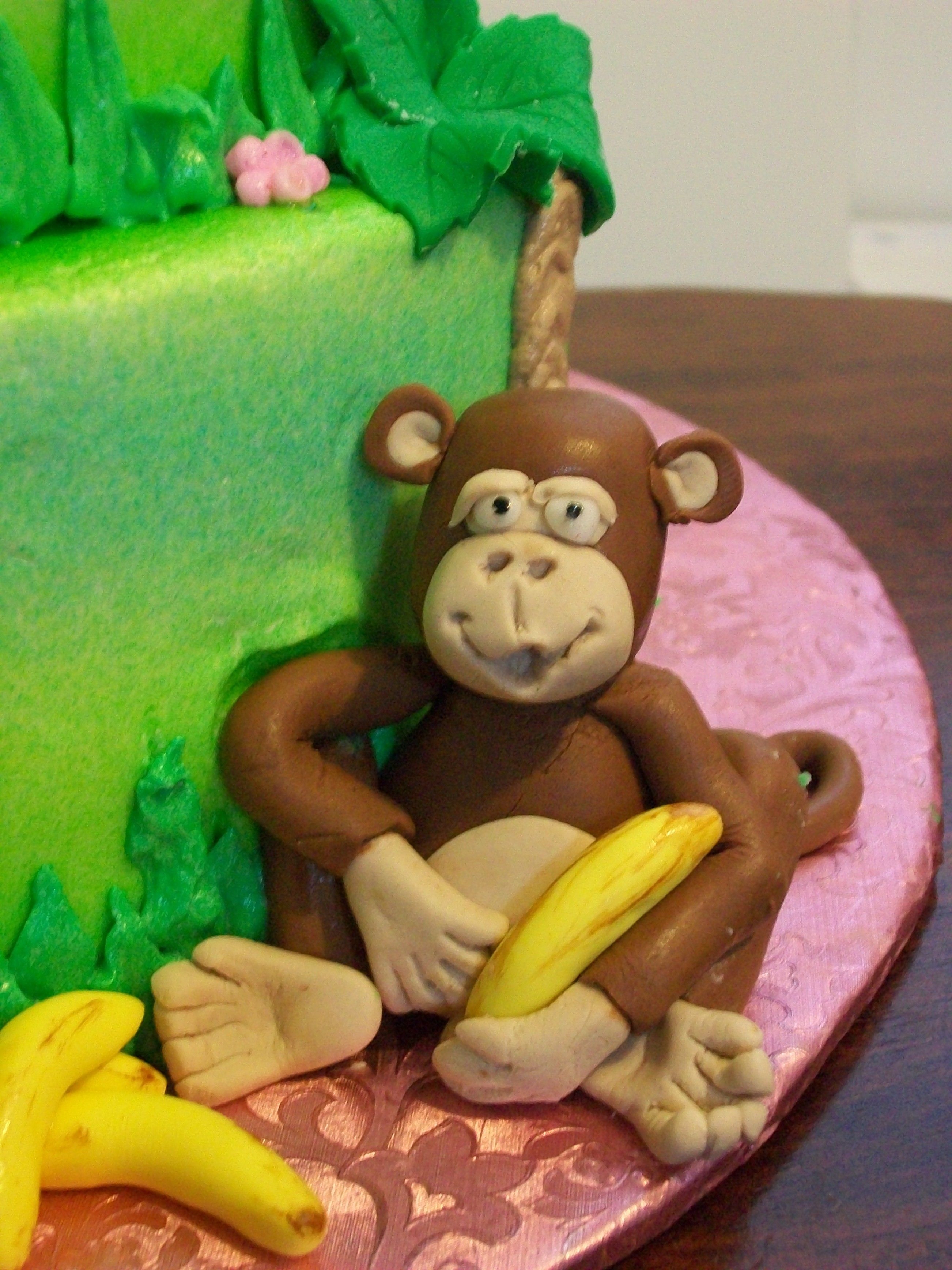 7 and 9in banana cake with chocolate fudge filling, iced in b/c. Air brushed backround color, fondant leaves, bananas and monkeys. Used aine2 video on making the little monkeys.
