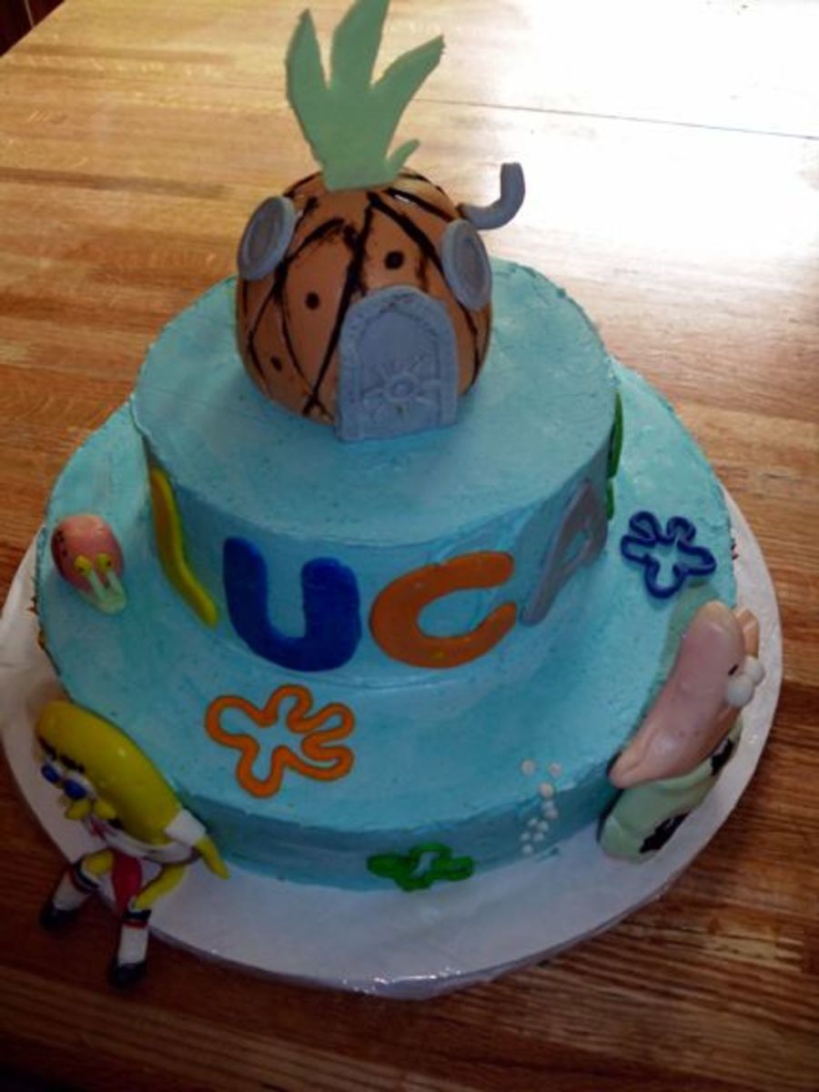 i made this for my nephew's 4th birthday party today. it's a chocolate chip cake (colored extra yellow), frosted and filled with mary kay frosting and fondant spongebob, patrick, gary, pineapple and letters (they spell out lucas). thanks for looking!