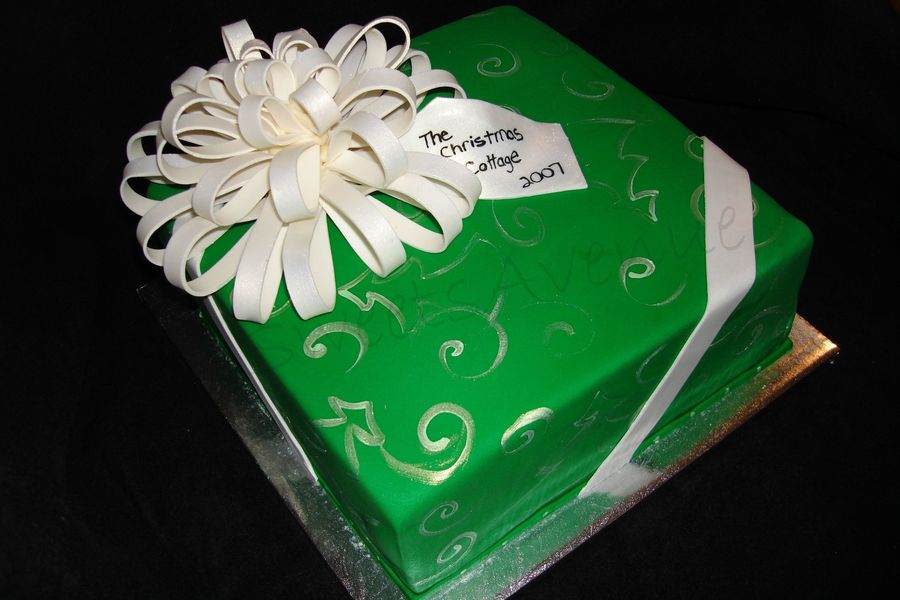 One of two cakes for a craft business that is only open 2 weeks a year for the holiday season. 10" square cake Bow is about 8" in diameter at the widest point