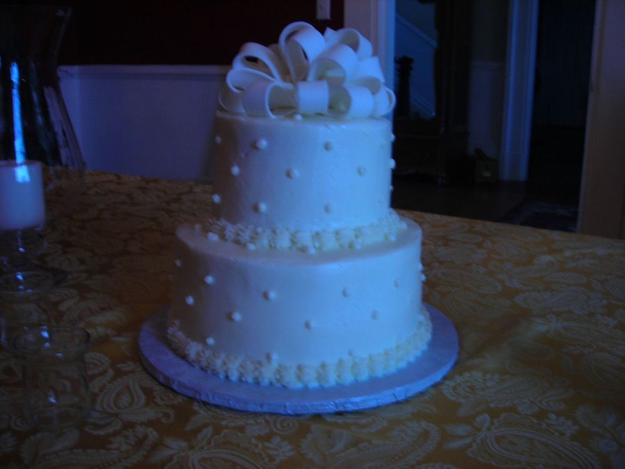 This cake is rainbow colored sour cream french vanilla with buttercream icing. Swiss dots and a fondant bow finish it off.