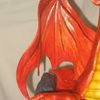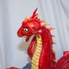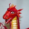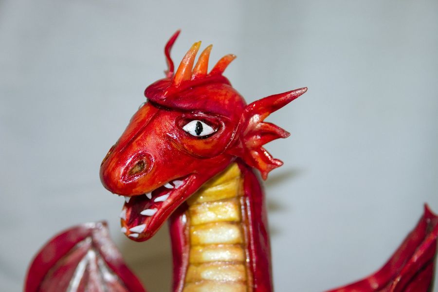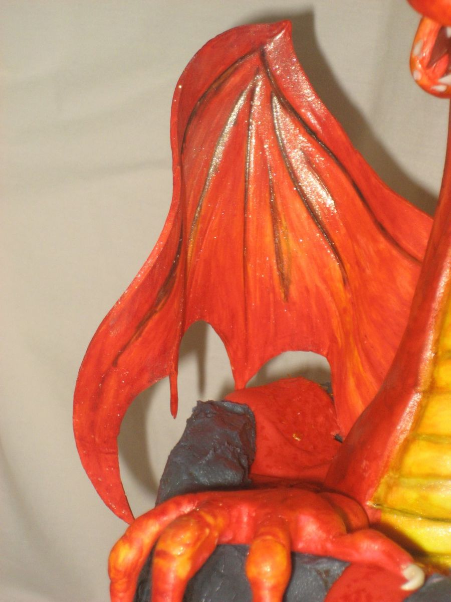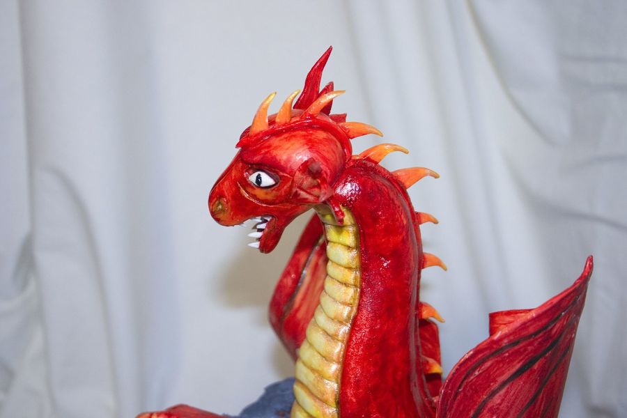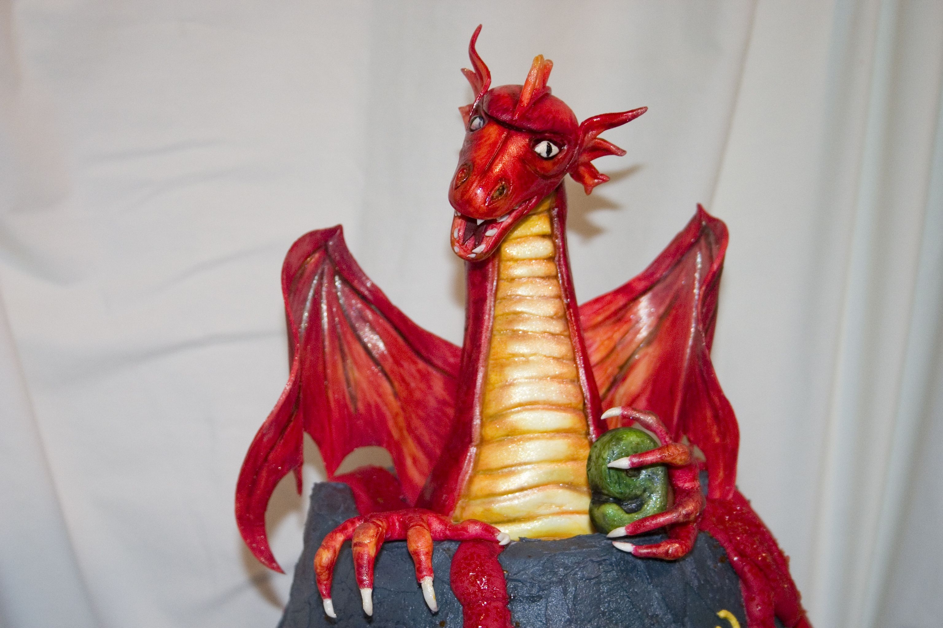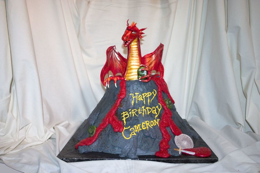 This is a layerd cake volcano covered in grey buttercream and royal icing lava with orange, red, and yellow edible glitter. The dragon is hand sculpted out of fondant with a little tylose mixed in so it would get hard. The wings were made seperately out of gumpaste. Everything was hand painted. the tiny shield and sword were gum paste as well.