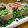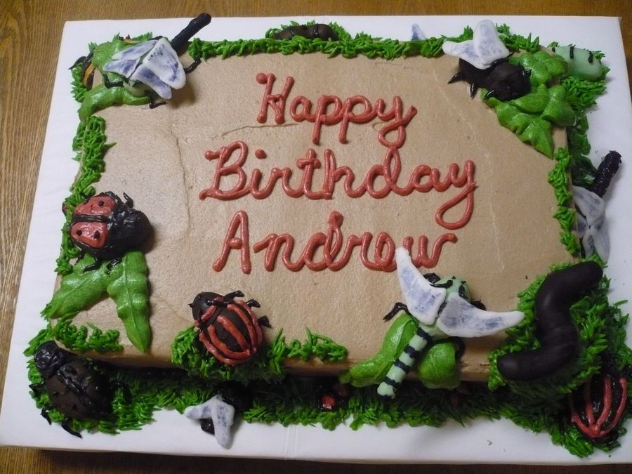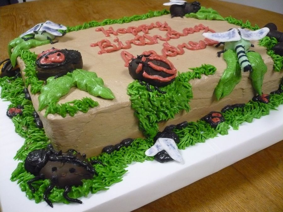 Chocolate cake/BC frosting and decorations. Bugs are peanut butter balls made into shapes and dipped in chocolate, painted with tinted white chocolate, wings are RI.