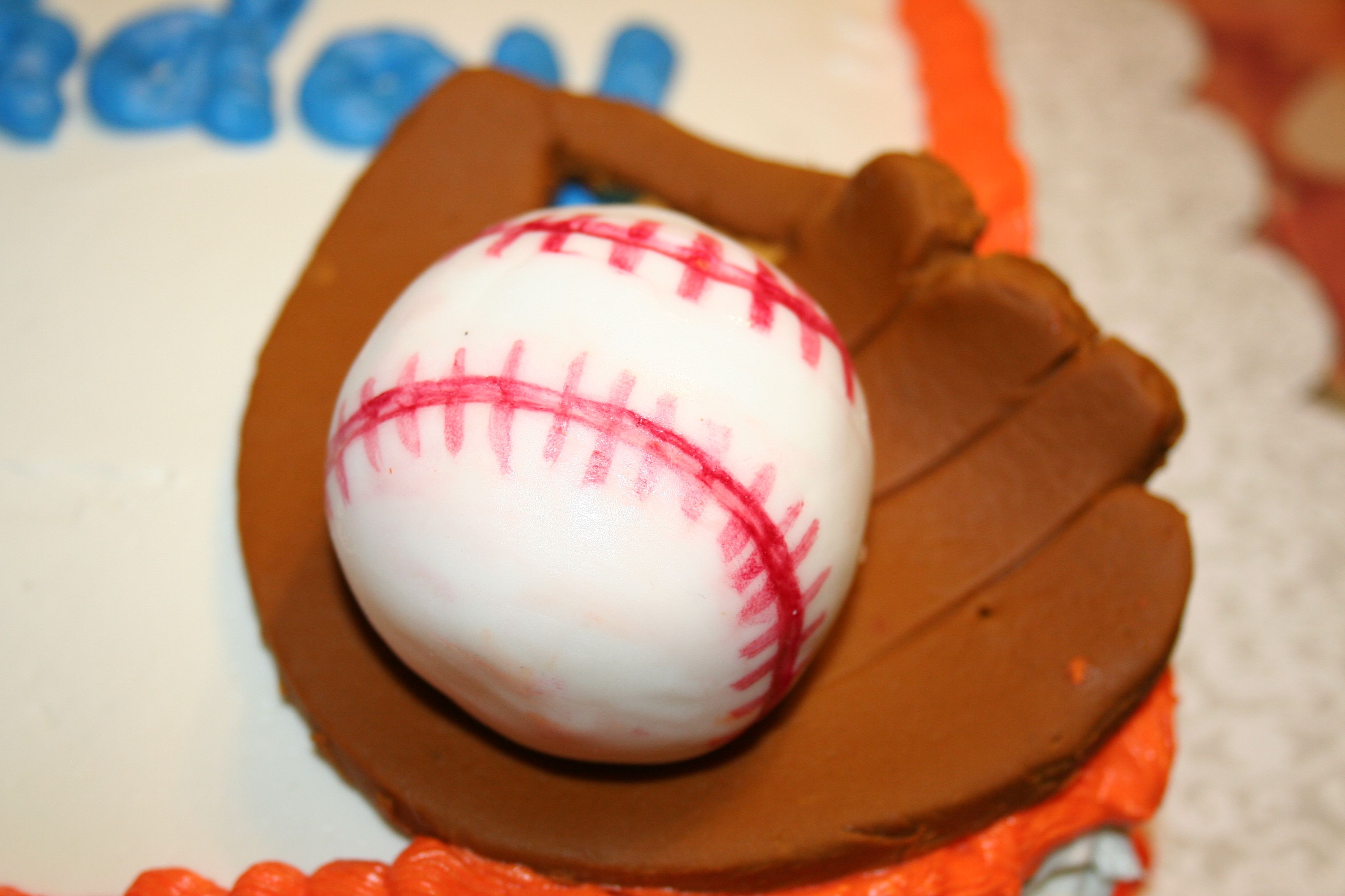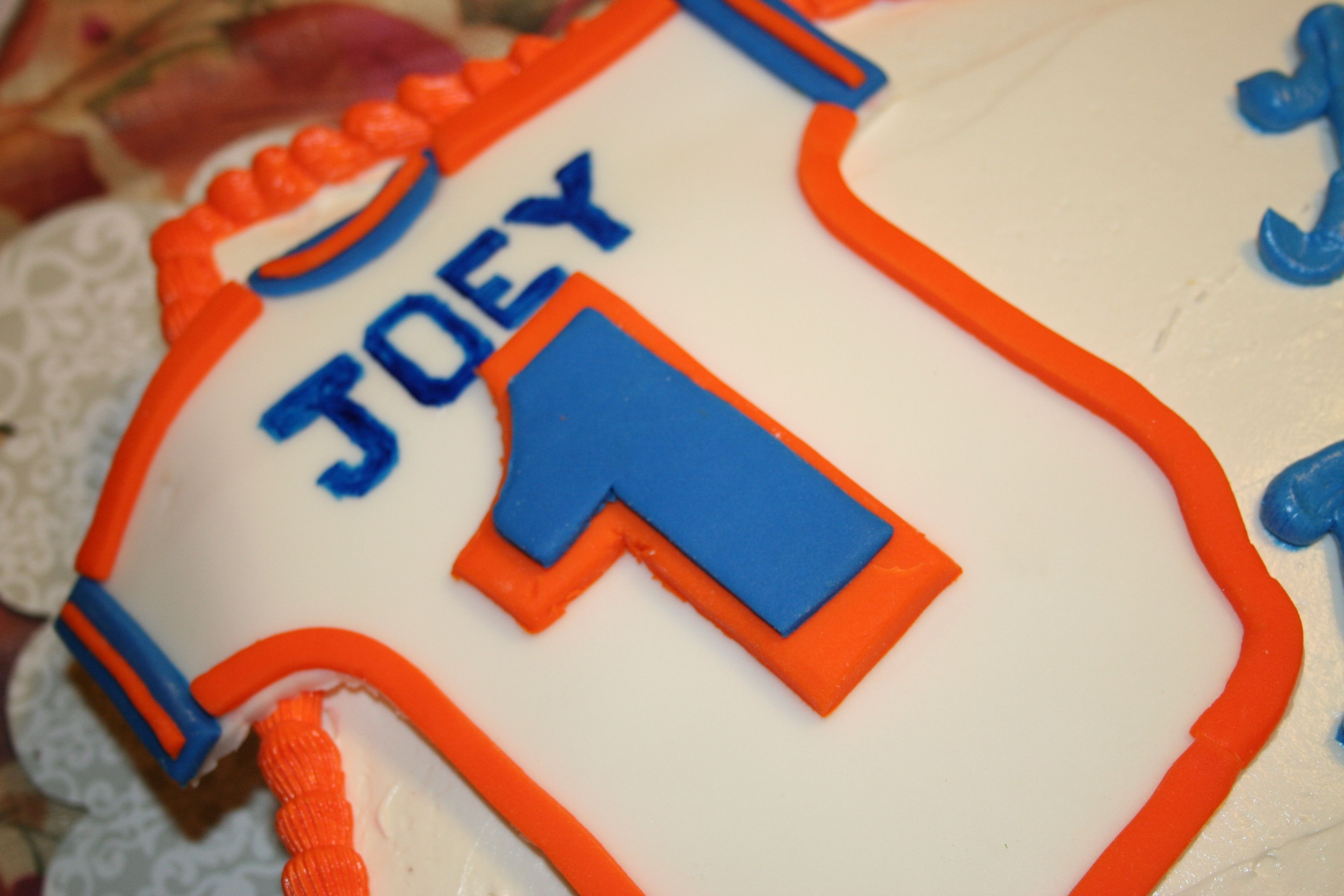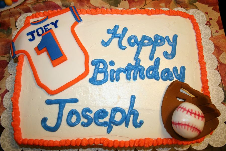 Baseball Cake for Baby's 1st Birthday. Parents were Mets fans, so we used their colors. Chocolate Cake with Fluffy Puff Vanilla Icing. Jersey, Mitt and Ball all constructed from fondant.