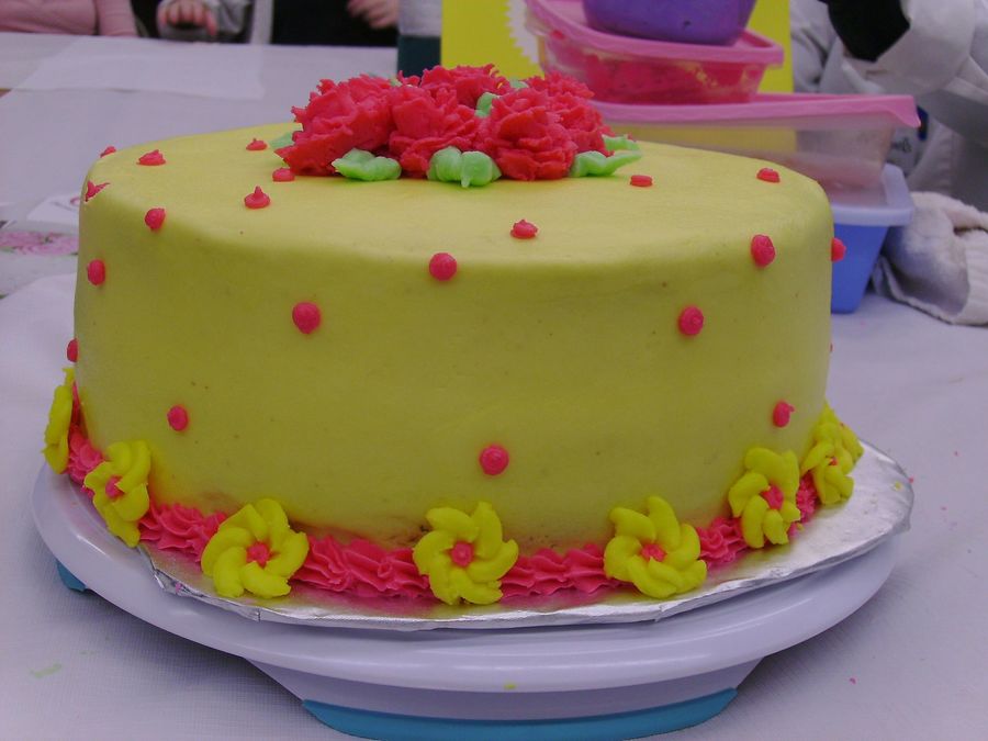 This was done for my Wilton class. My first time doing a cake with Wilton roses. It was yellow cake with lemon filling. My colors came out way brighter than I wanted to, but it still looked ok in the end.