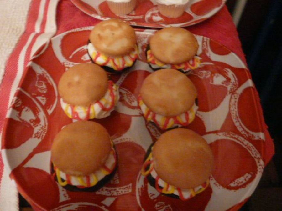 Here are some hamburger cupcakes I did to go with a grill cake and other cookout themed goodies for my husband for Father's Day. I also had hamburger cookies, hot dog cookies and cupcakes and watermelon and corn on the cob cookies. Thanks!